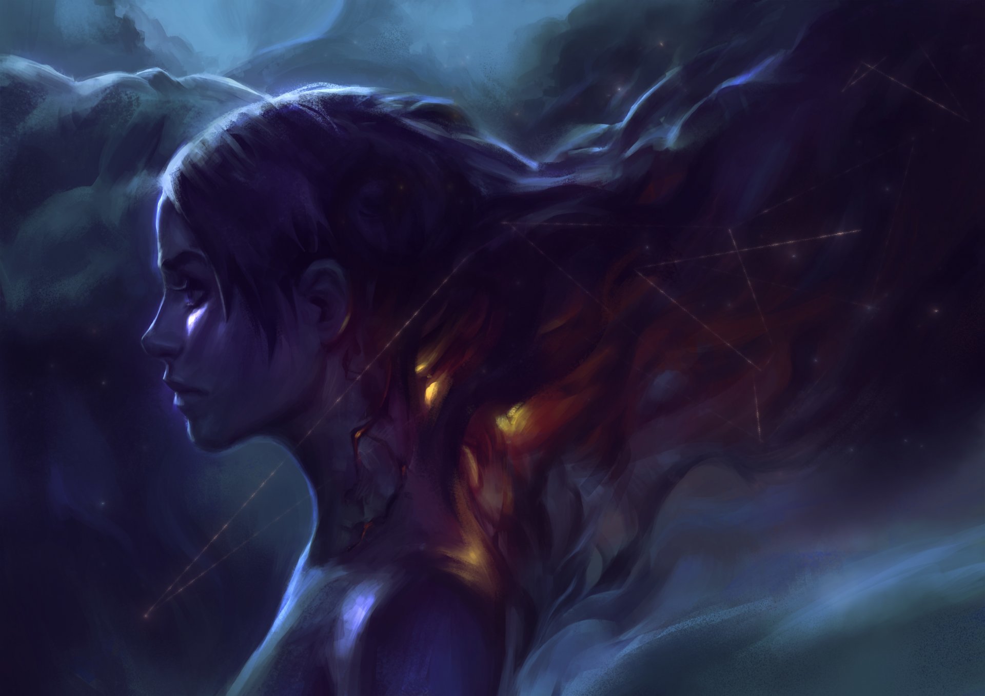 Disegno di una ragazza su uno sfondo scuro con spalle nude