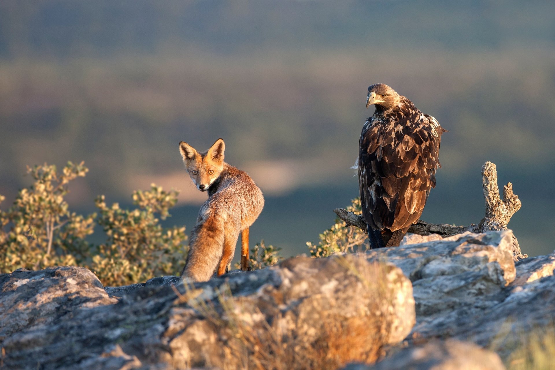 La volpe accanto all'aquila si voltò e guardò la telecameraLa volpe accanto all'Aquila si voltò e guardò la telecamera