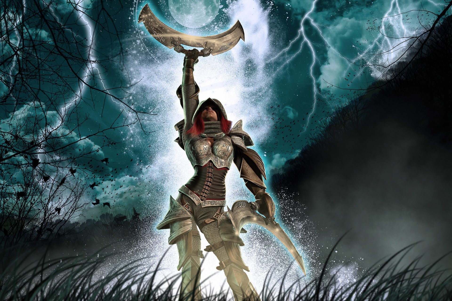Guerriero corazzato con armi spaziali sotto la pioggiaGuerriero corazzato con armi spaziali sotto la pioggia
