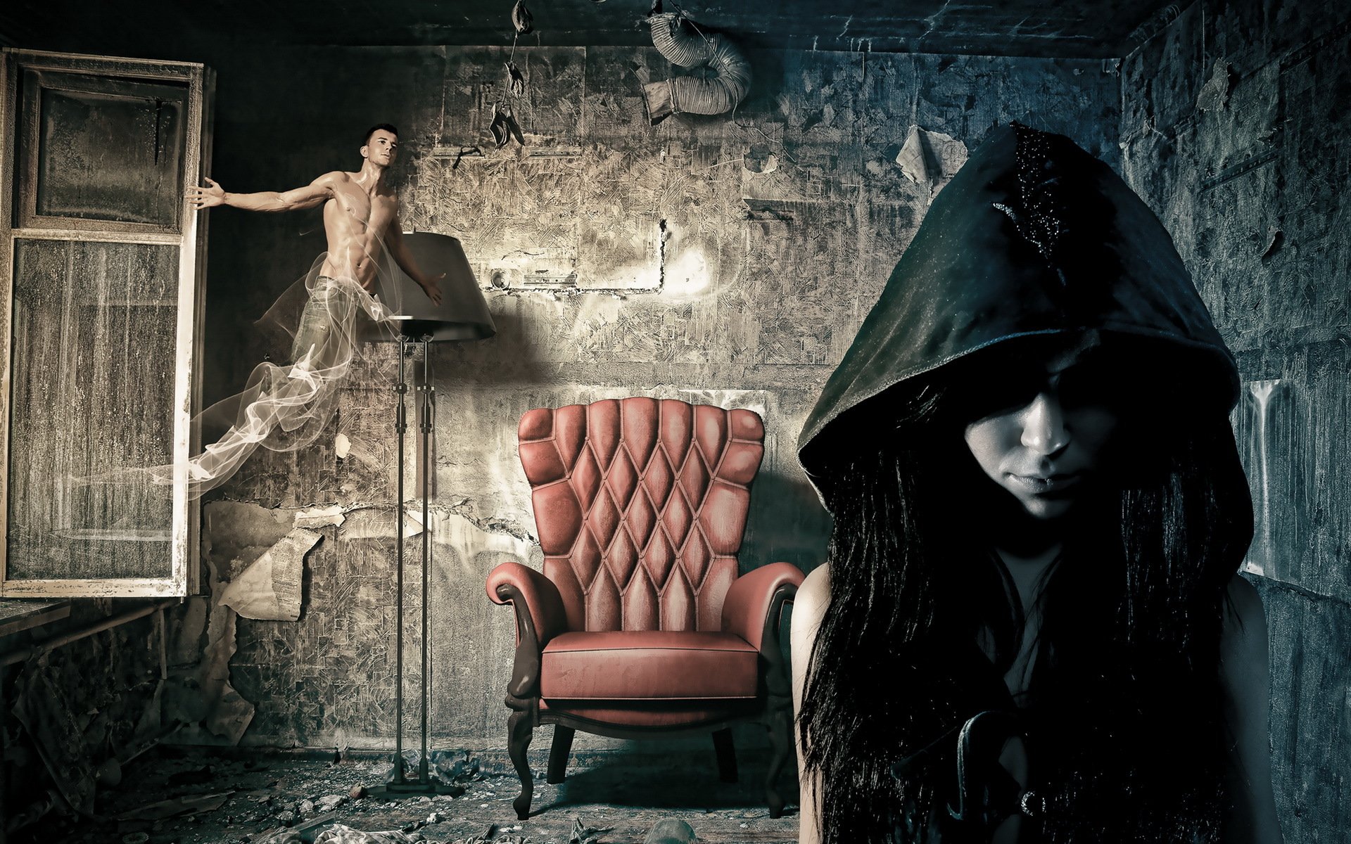 La ragazza incappucciata sta con le spalle al ragazzo e alla sediaLa ragazza incappucciata sta con le spalle al ragazzo e alla sedia