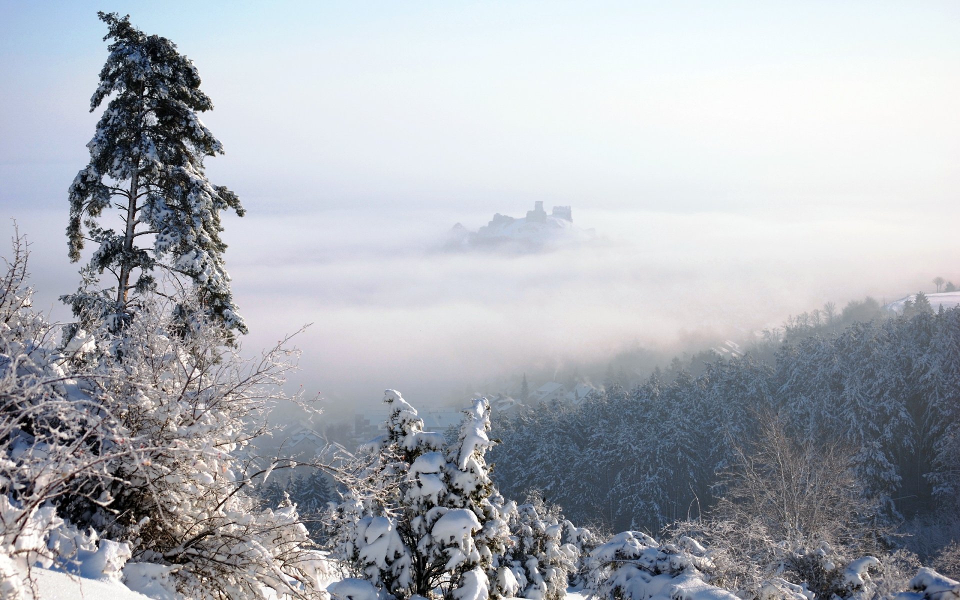 Una fitta nebbia copriva le cime delle montagne con la sua coperta bluUna fitta nebbia copriva le cime delle montagne con la sua coperta blu