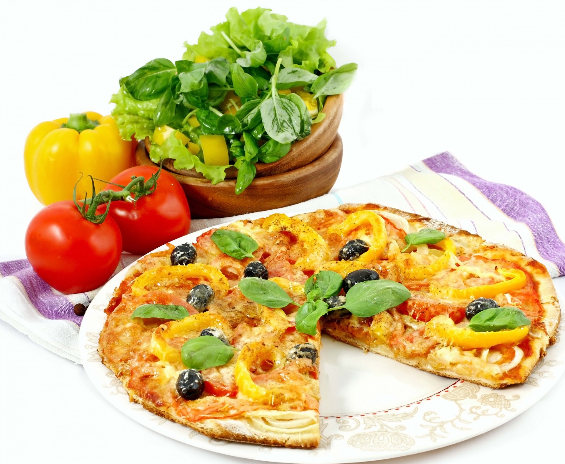Su uno sfondo bianco si trova una pizza con deliziose verdureSu uno sfondo bianco si trova una pizza con deliziose verdure
