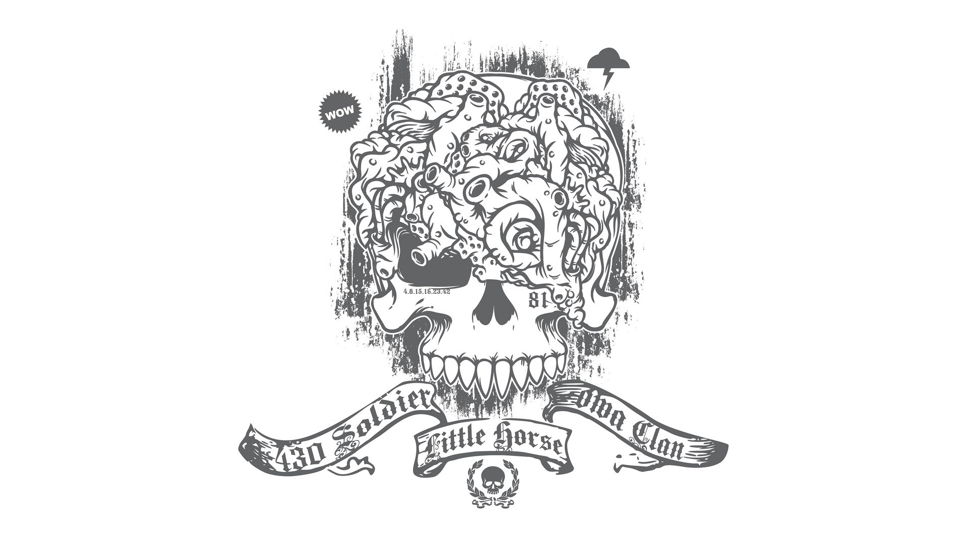 Cranio con gli occhi azzurri su sfondo nero, e macchie biancheCranio con gli occhi azzurri su sfondo nero, e macchie bianche
