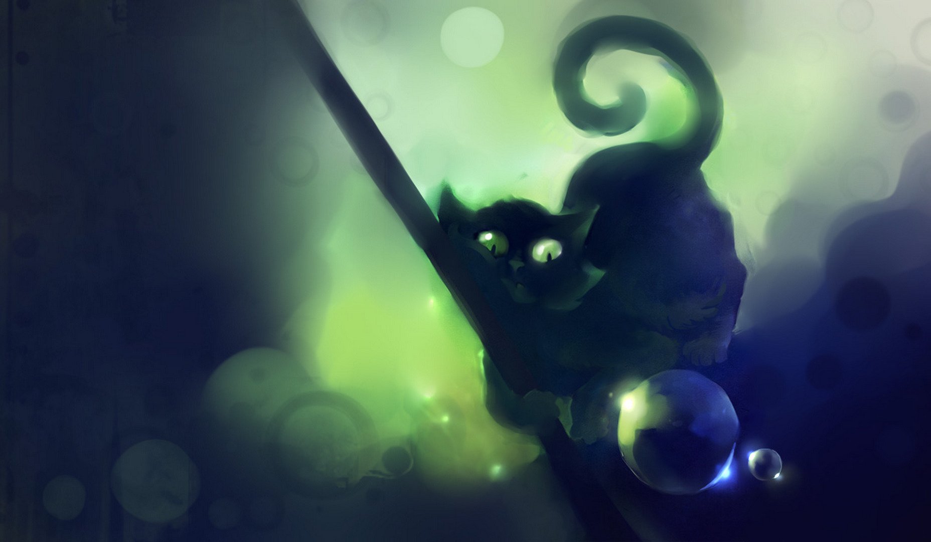 Disegno di un gatto nero con grandi occhi verdi. sullo sfondo di bolle nere e verdiDisegno di un gatto nero con grandi occhi verdi. Sullo sfondo di bolle nere e verdi