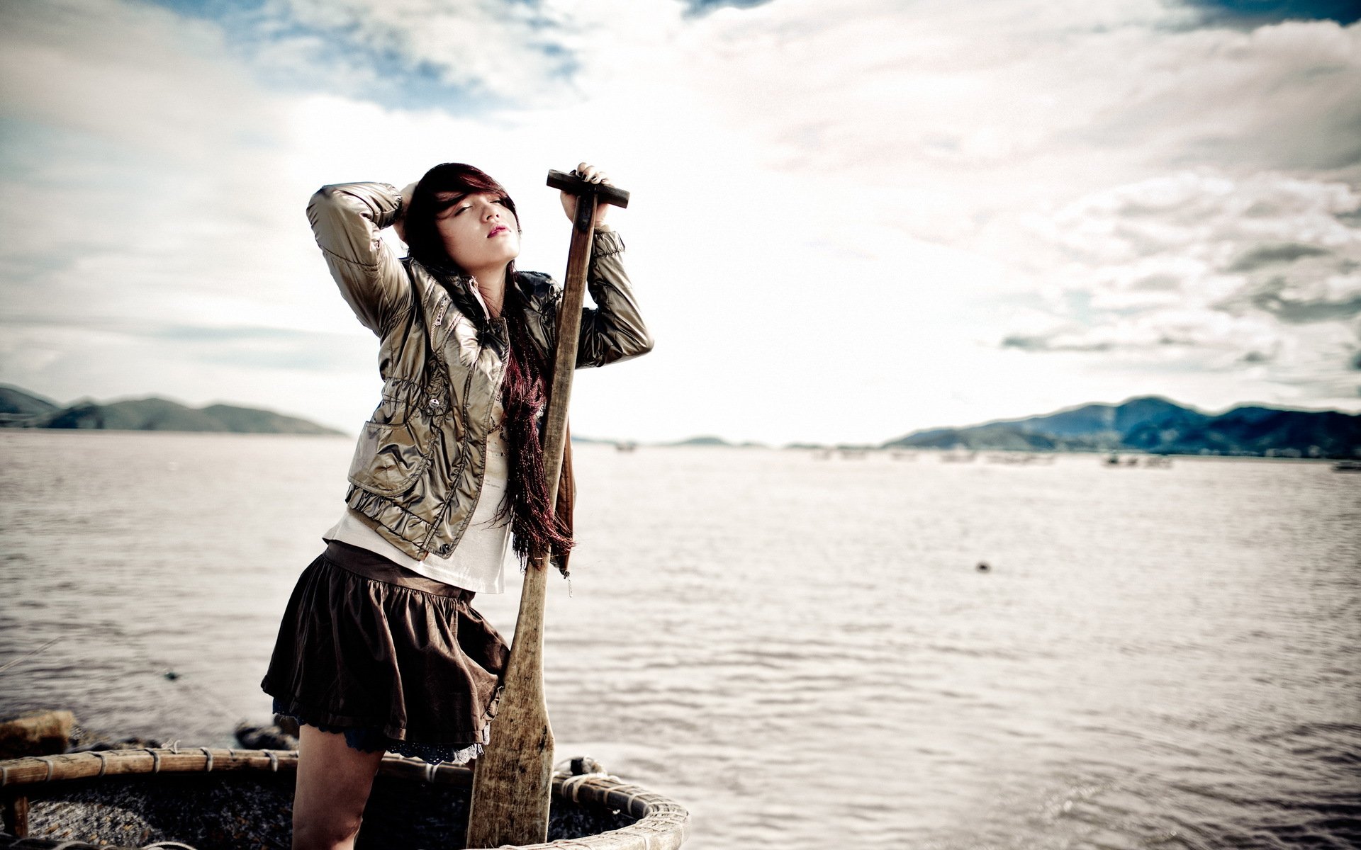 Ragazza con fiori in trecce e in camicia da notte in piedi in acquaRagazza con fiori in trecce e in camicia da notte in piedi in acqua