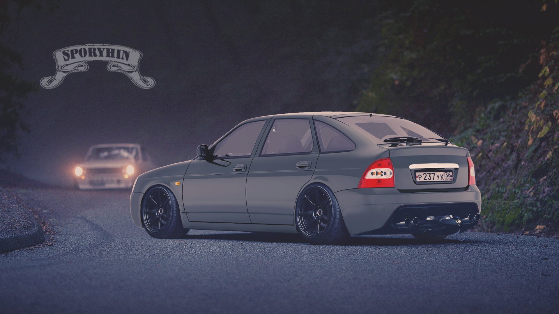 Macchina sintonizzata rossa sulla strada del villaggioMacchina sintonizzata rossa sulla strada del villaggio