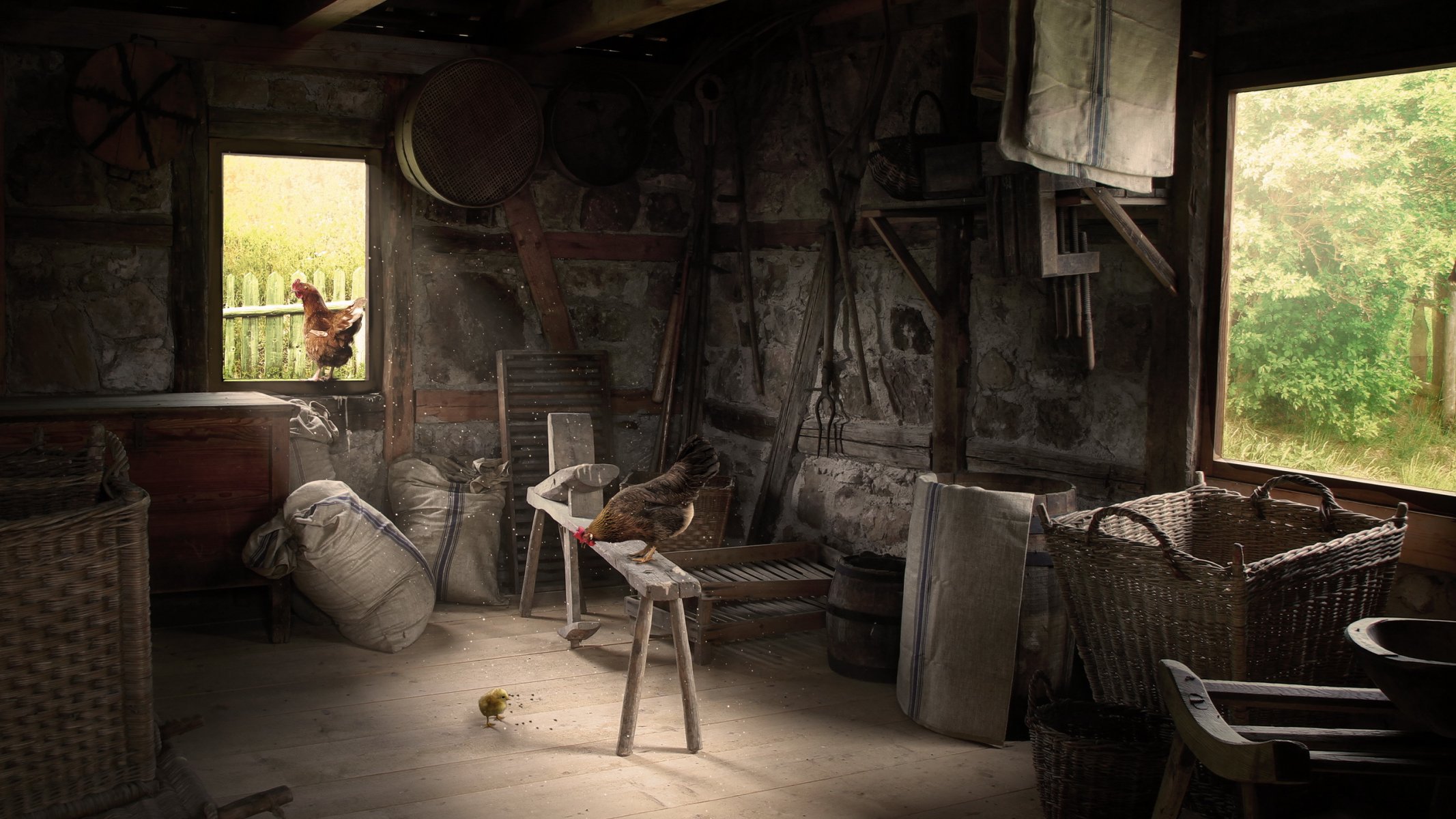 Fienile rustico con polli e tutti i tipi di utensiliFienile rustico con polli e tutti i tipi di utensili