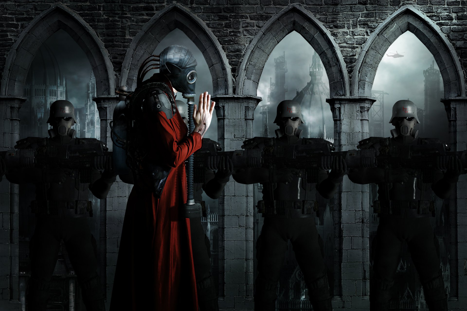 Combattenti nel gioco della metropolitana 2033 in giubbotti antiproiettile contro una chiesa e un cielo limpidoCombattenti nel gioco della metropolitana 2033 in giubbotti antiproiettile contro una chiesa e un cielo limpido