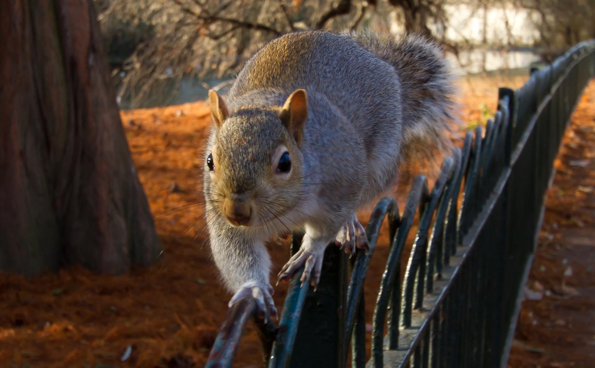 Scoiattolo che si arrampica sul recinto del parco autunnale