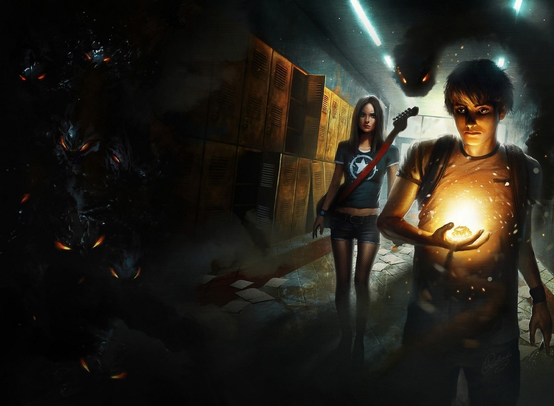 Un ragazzo con una pietra luminosa, e una ragazza con una chitarra