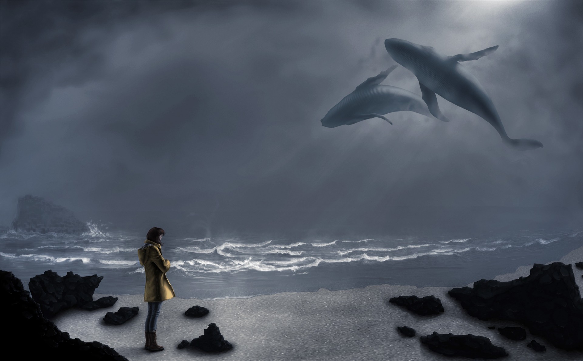 Immagine con le balene nel cielo. uomo solitario sulla rivaImmagine con le balene nel cielo. Uomo solitario sulla riva