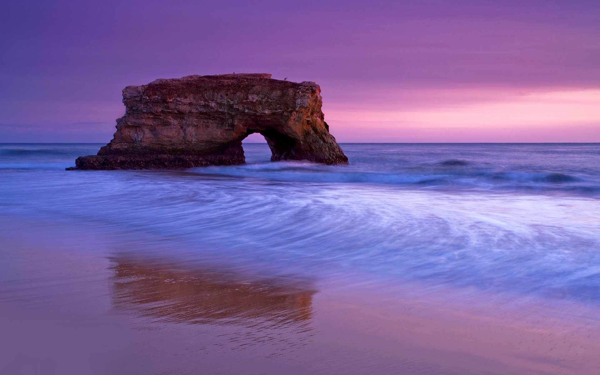 Riflessi di un tramonto rosa su uno sfondo blu scuro del cielo sopra le rocce