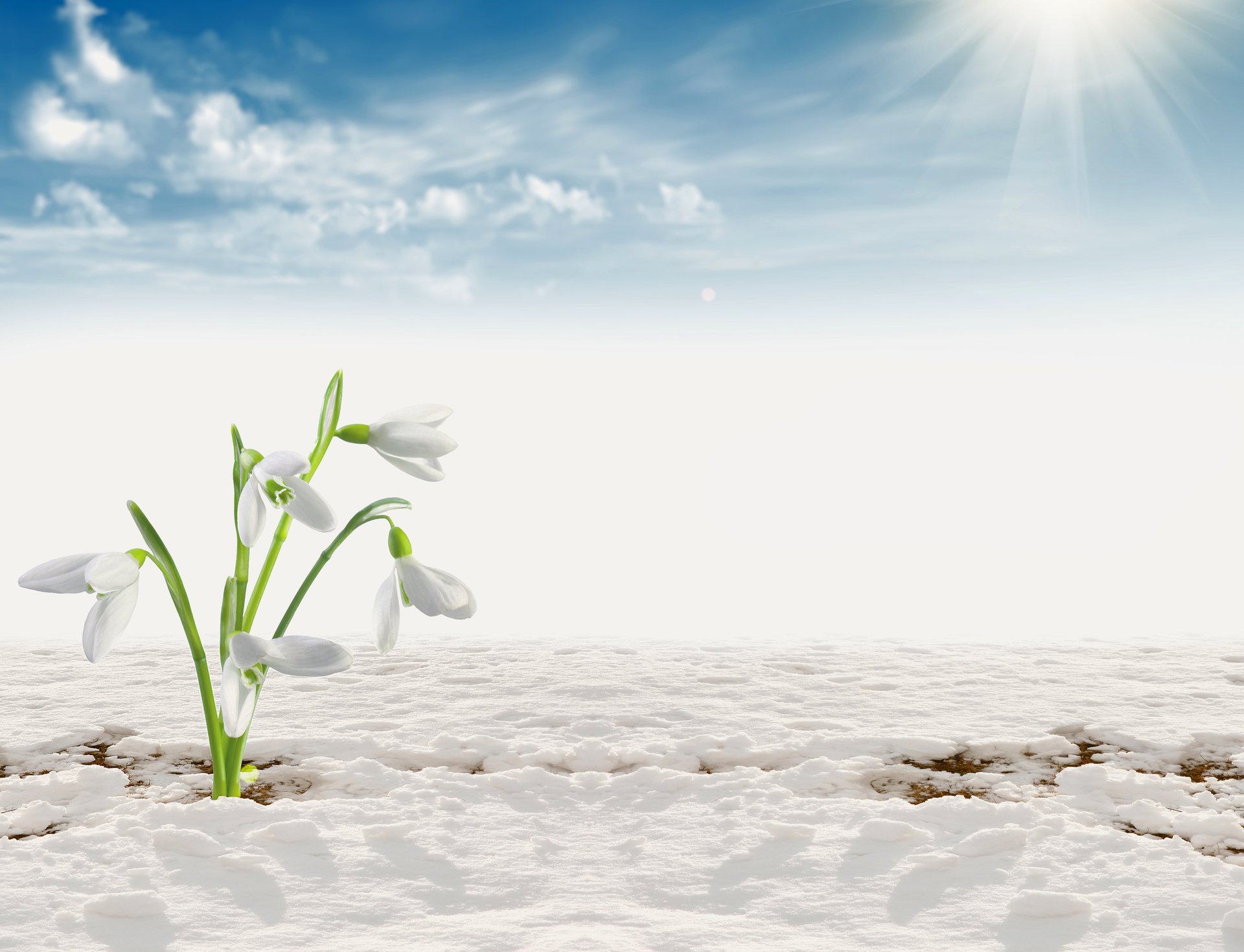Bucaneve sulla neve su uno sfondo di cielo nuvolosoBucaneve sulla neve su uno sfondo di cielo nuvoloso