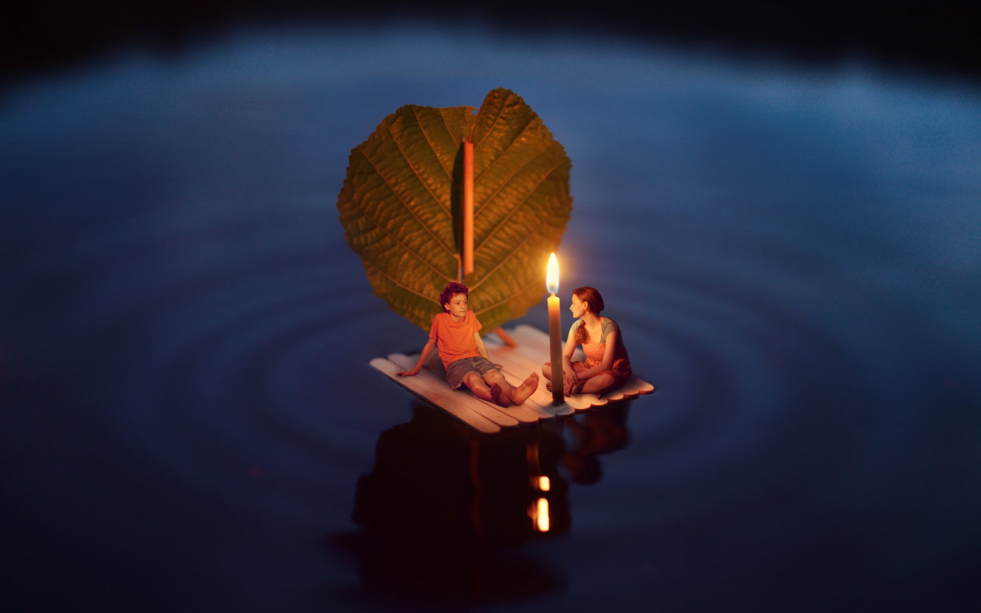 I due navigano su una zattera a vela da una fogliaI due navigano su una zattera a vela da una foglia
