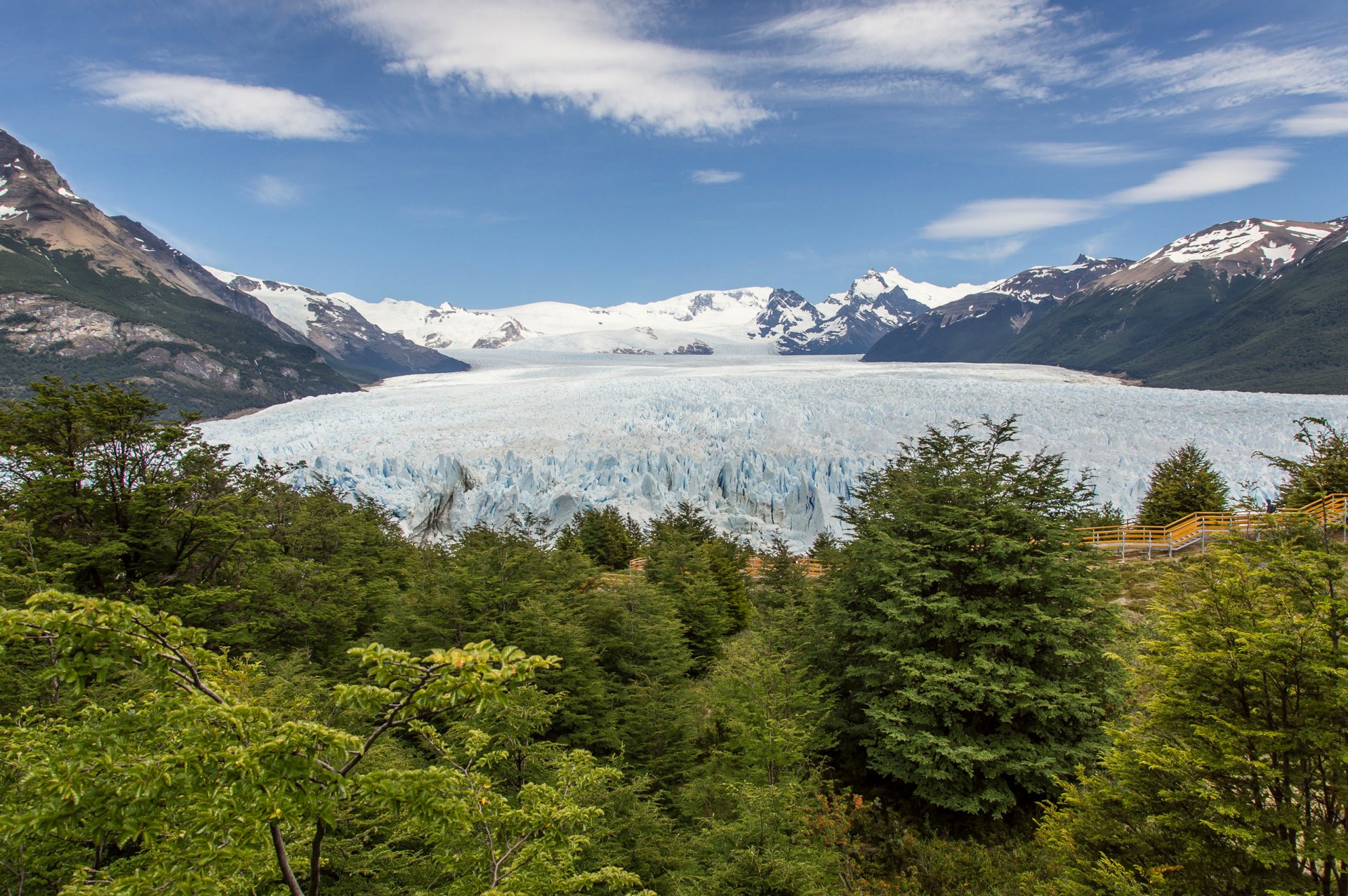 Il ghiacciaio di montagna calpesta gli alberi verdi
