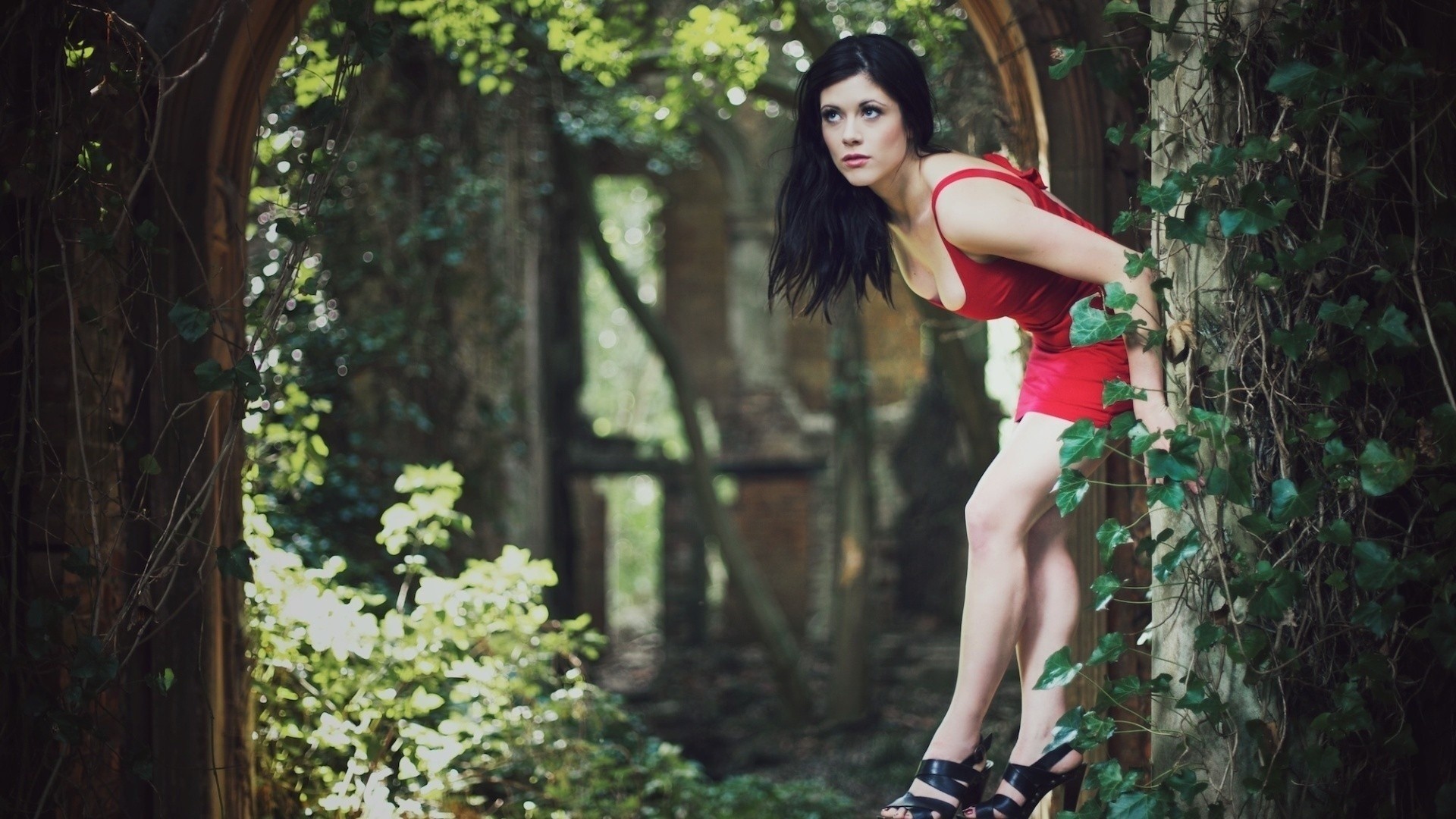 Ragazza snella in abito rosso su sfondo bianco Auto