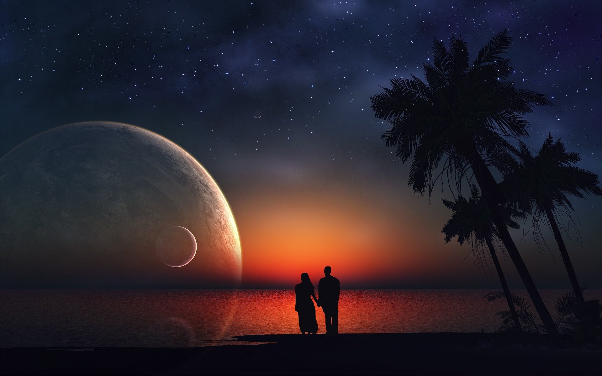 Uomo e donna che guardano il cielo con due pianeti che si tengono per mano