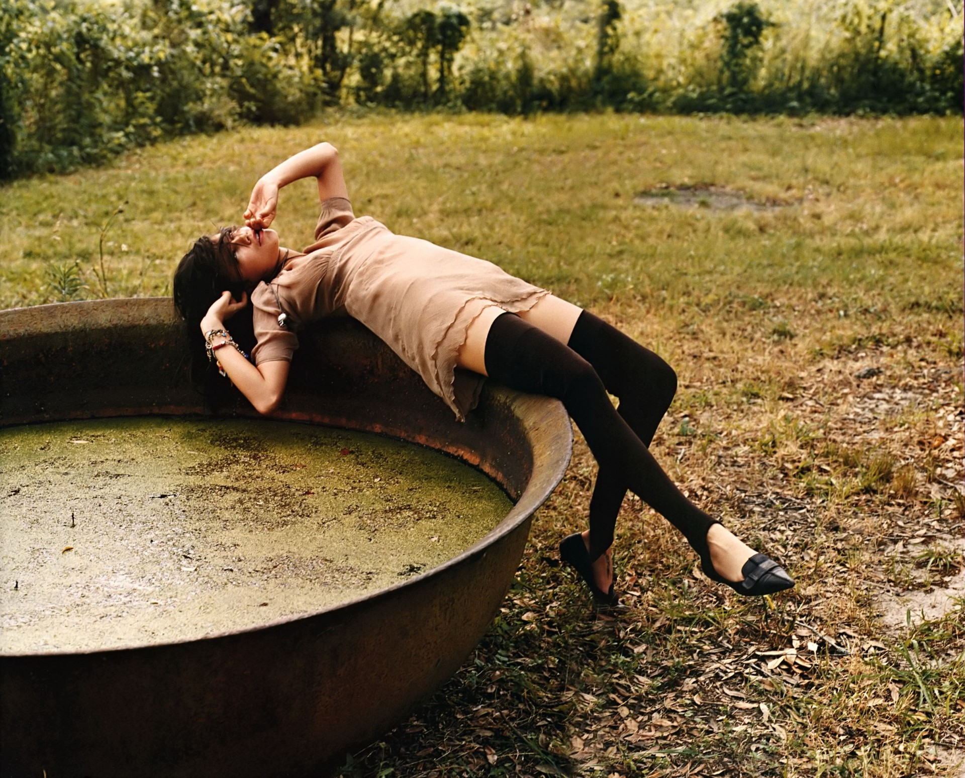 Ragazza in maglietta bianca e pantaloncini appoggiati al muro