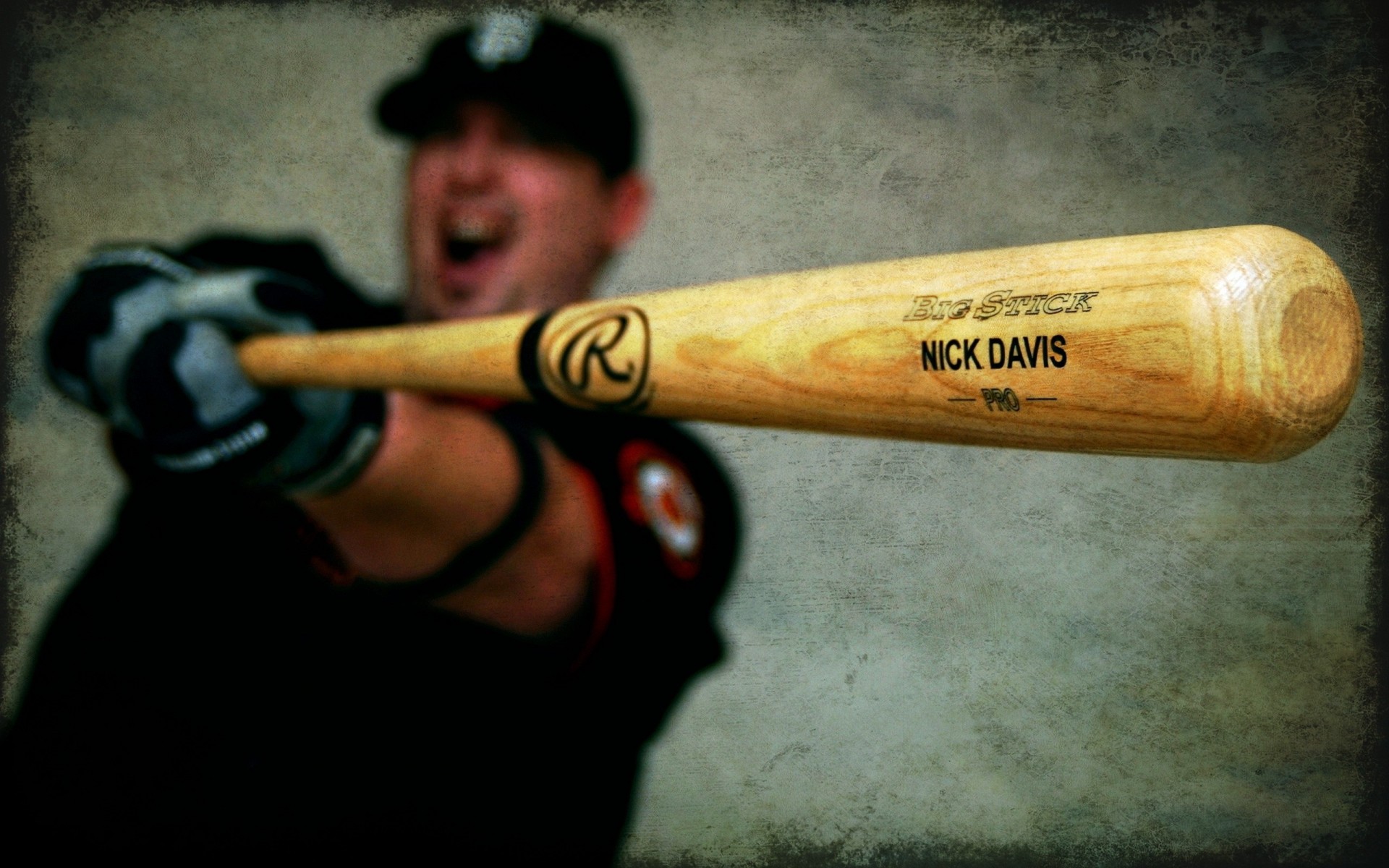 Uomo con una mazza con la bocca aperta su sfondo muro