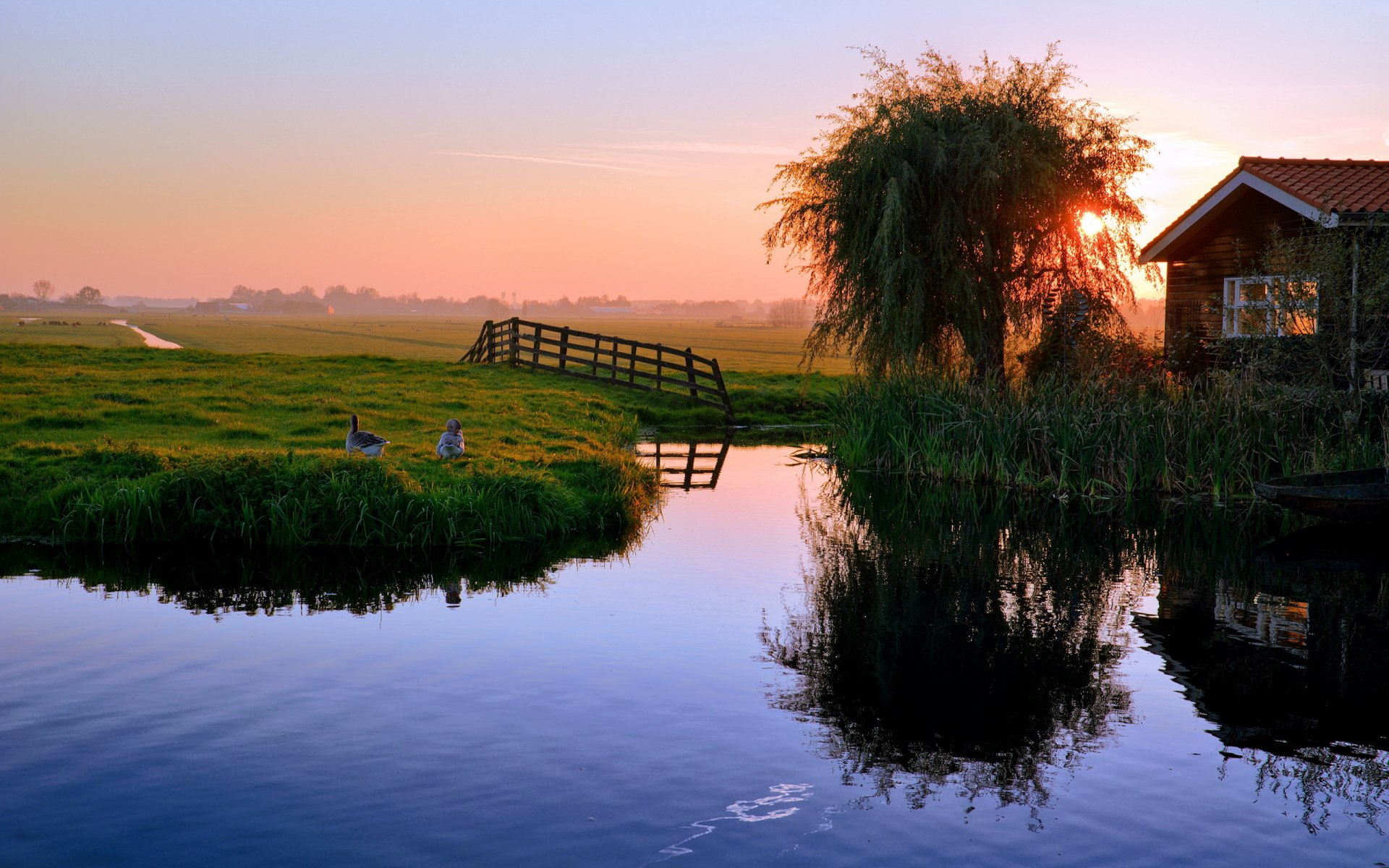 Stagno sullo sfondo del tramonto