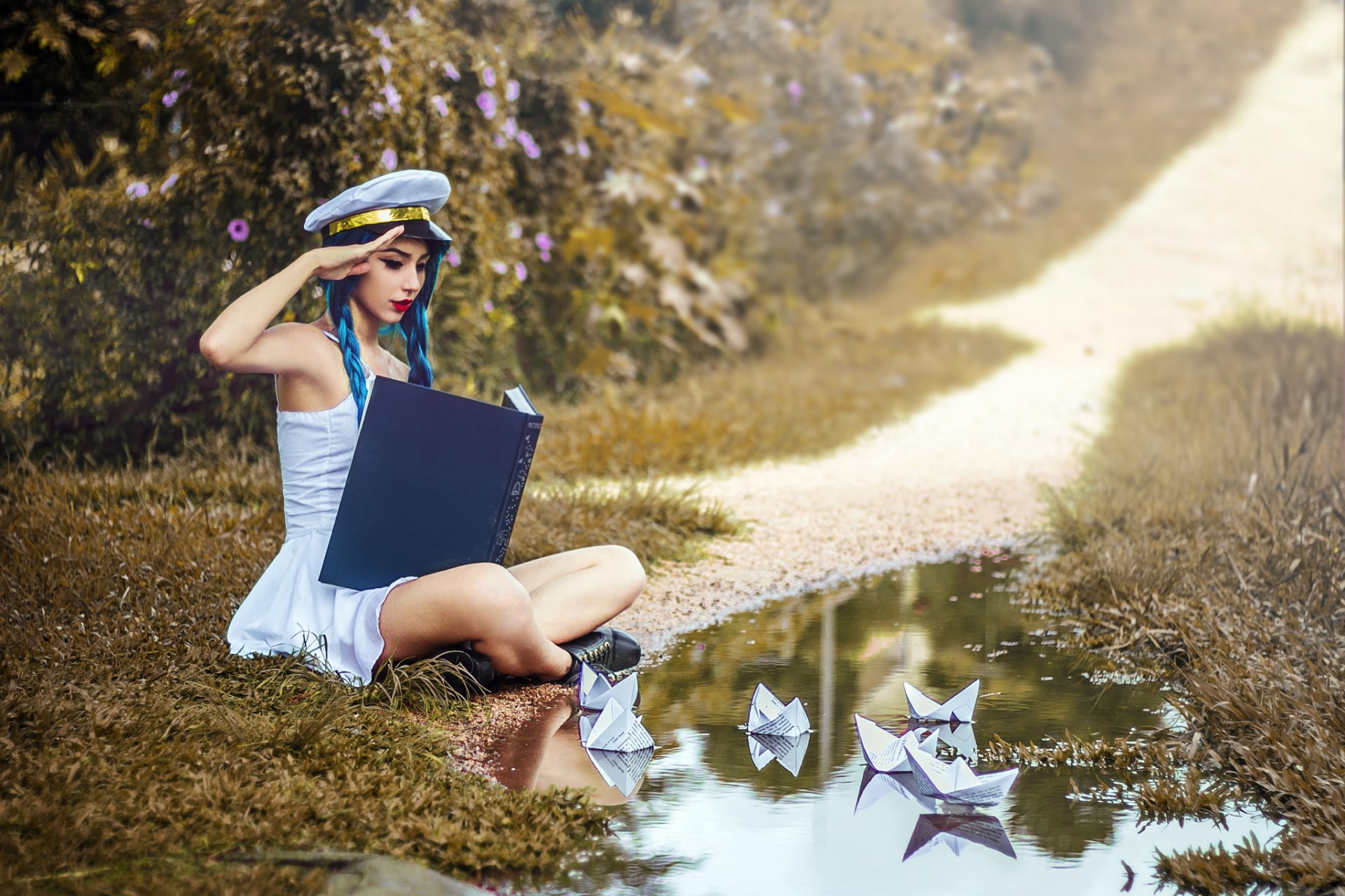 Ragazza che gioca, in una pozzanghera di carta barca, ragazza con il berretto del capitano