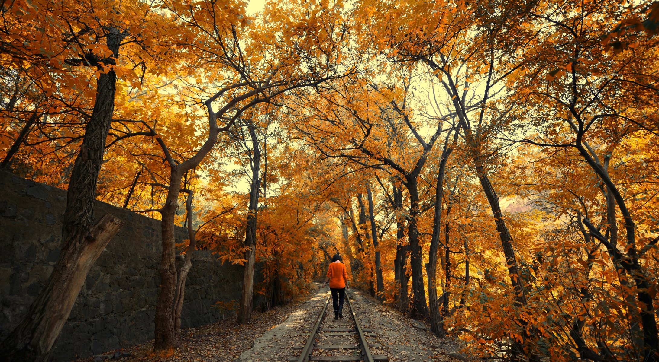 Ragazza asiatica in un berretto si siede sui binari del treno