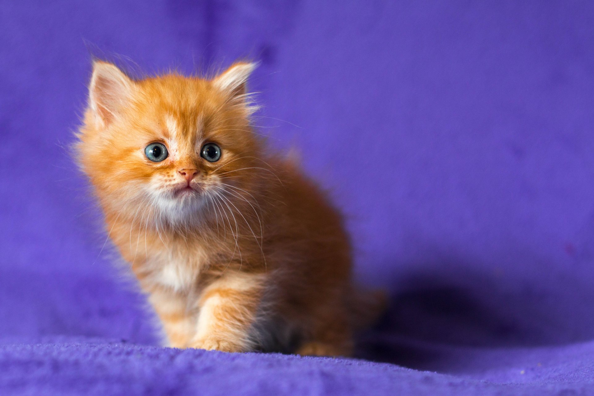 Gattino rosso dagli occhi azzurri su sfondo lilla