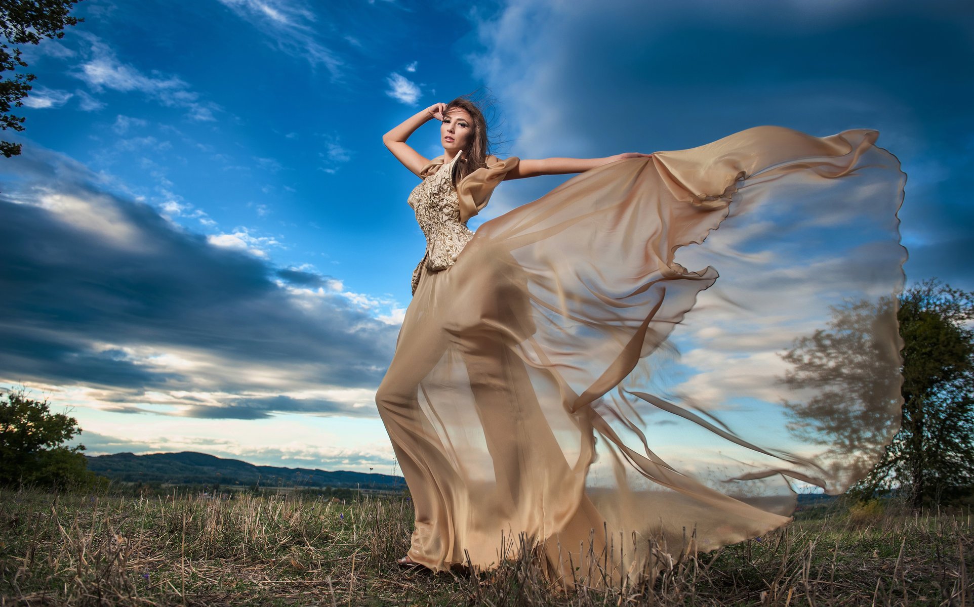 Ragazza in bel vestito in posa contro il cielo