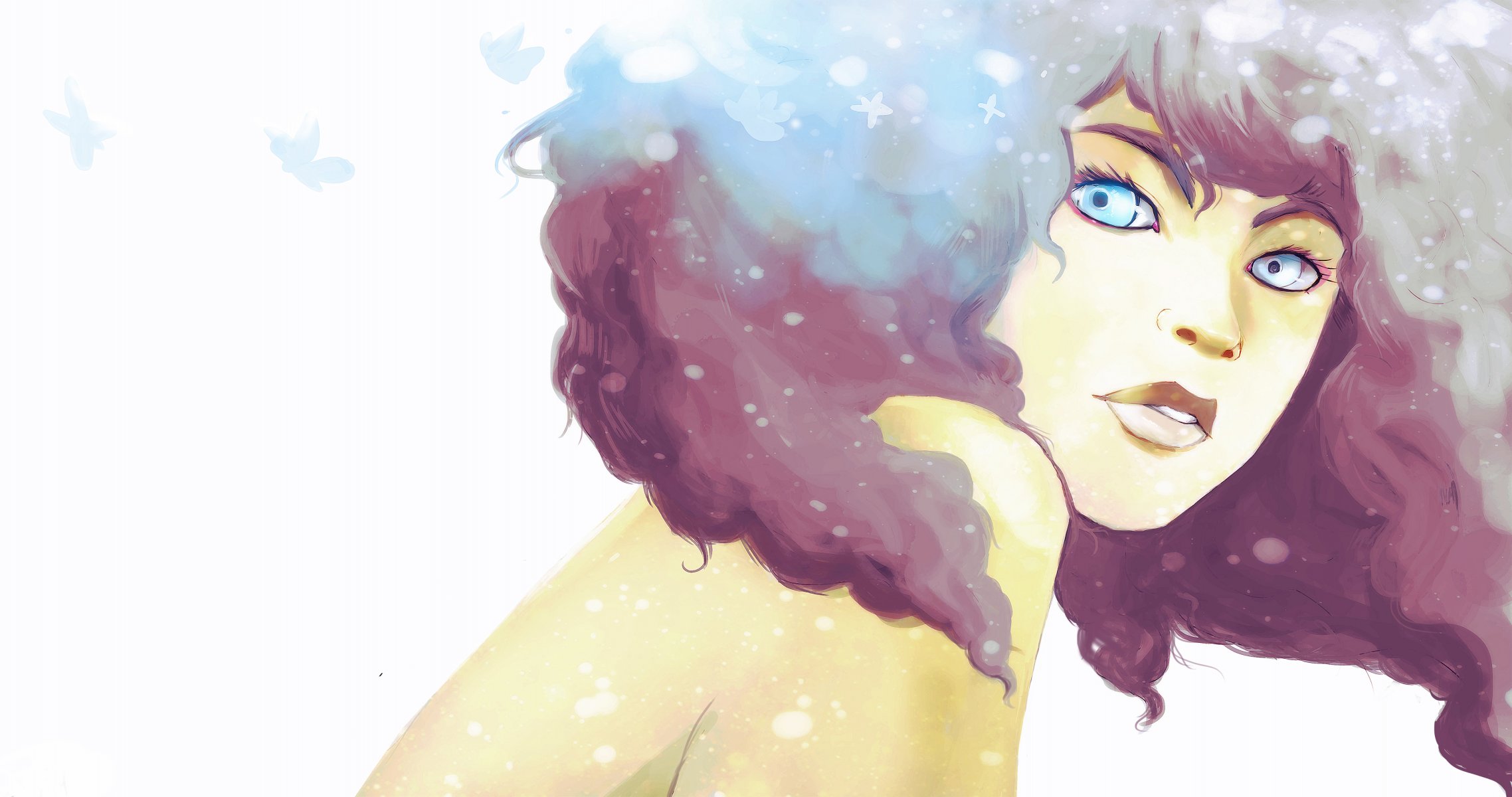 Faccia della ragazza con gli occhi azzurri e capelli ondulati