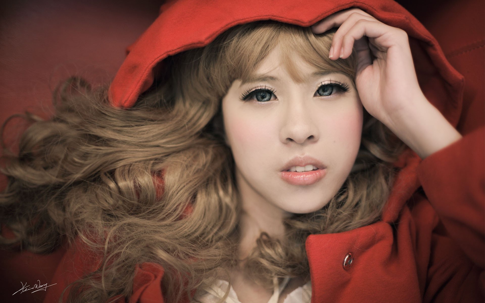 Faccia della ragazza con gli occhi azzurri e capelli ondulati