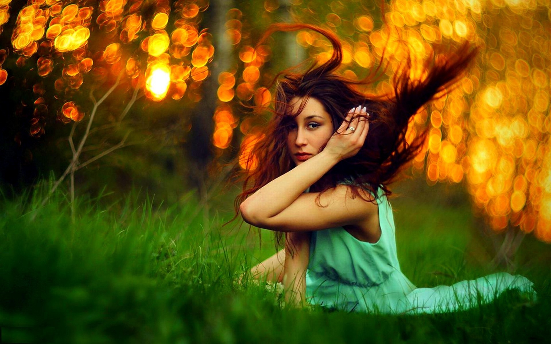 Ragazza con i capelli scuri in abito estivo, seduta sull'erba secca