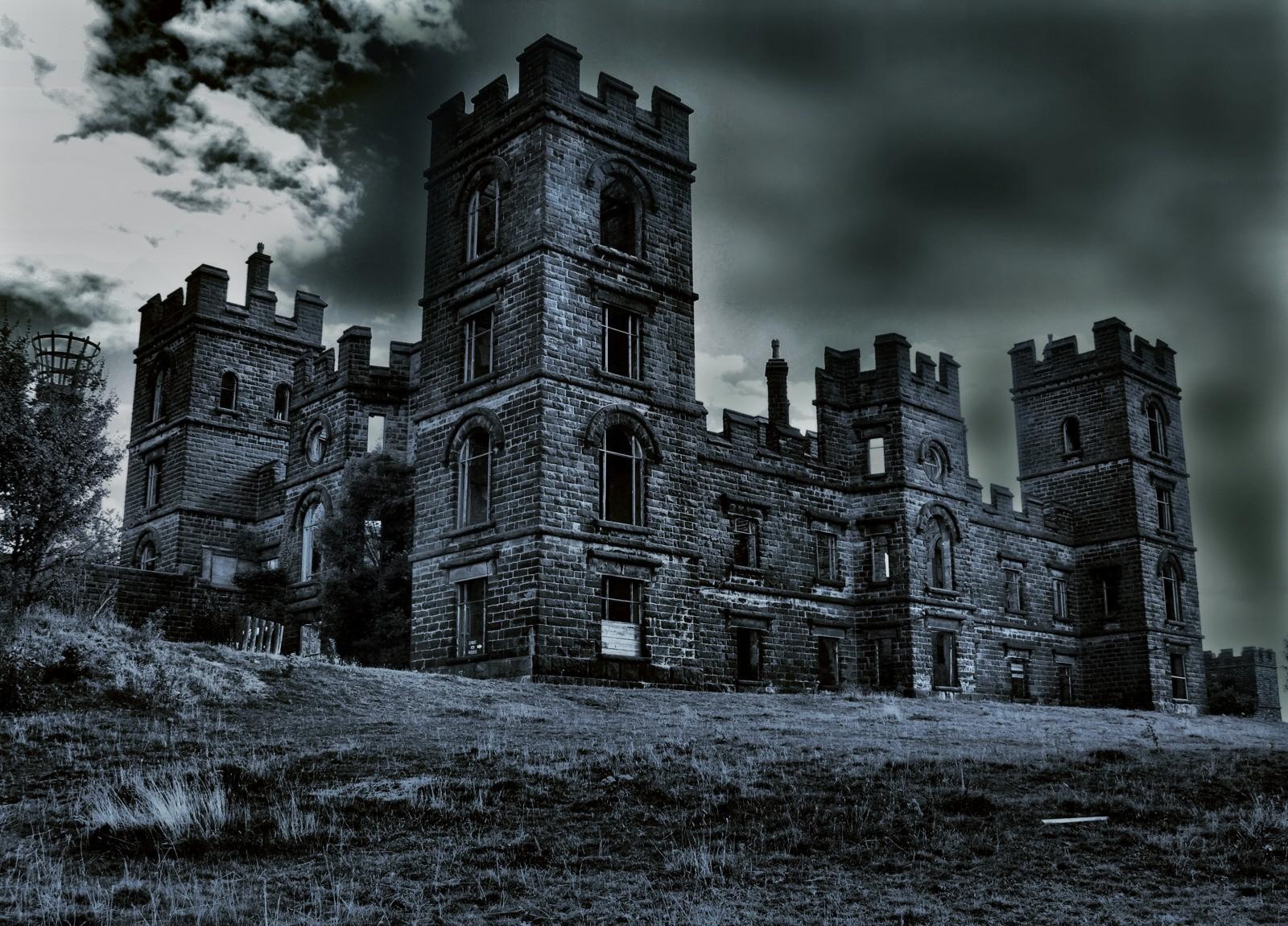 Castello dipinto sullo sfondo della luna che sorge dalle nuvole scure