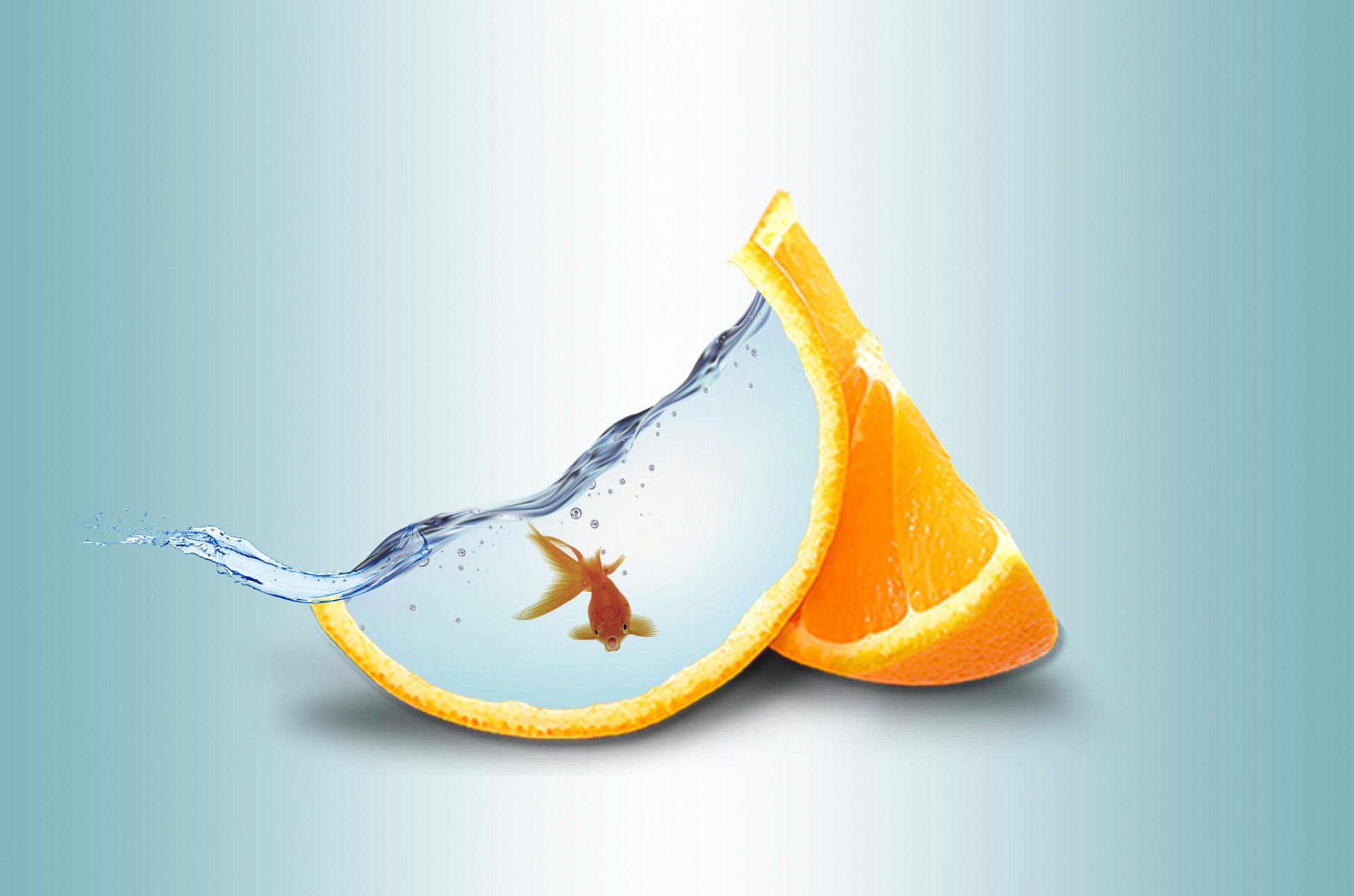 Due fette d'arancia con un pesce rosso in uno dei lobuli