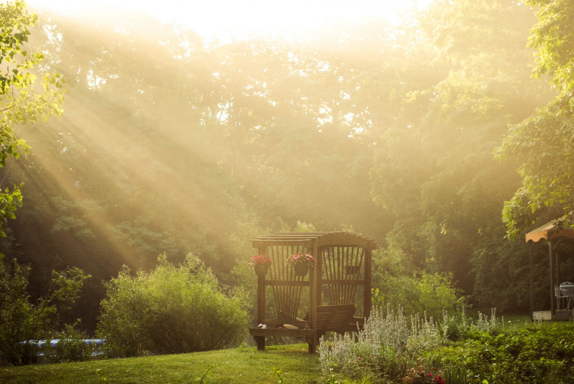 Natura all'alba. I raggi del sole illuminano la panchina sul prato