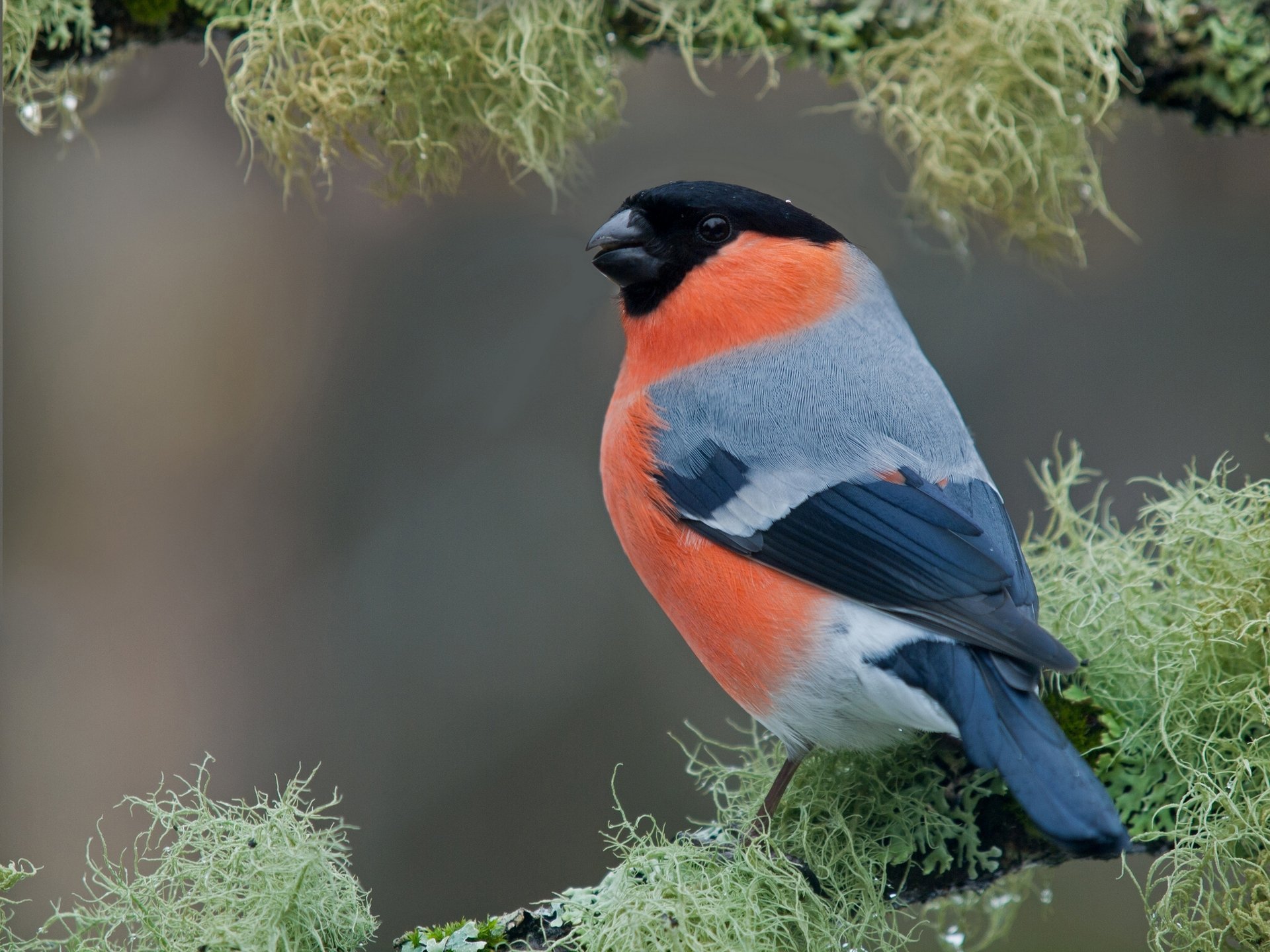 Ciuffolotto con petto rosso brillante su ramoscelli innevati