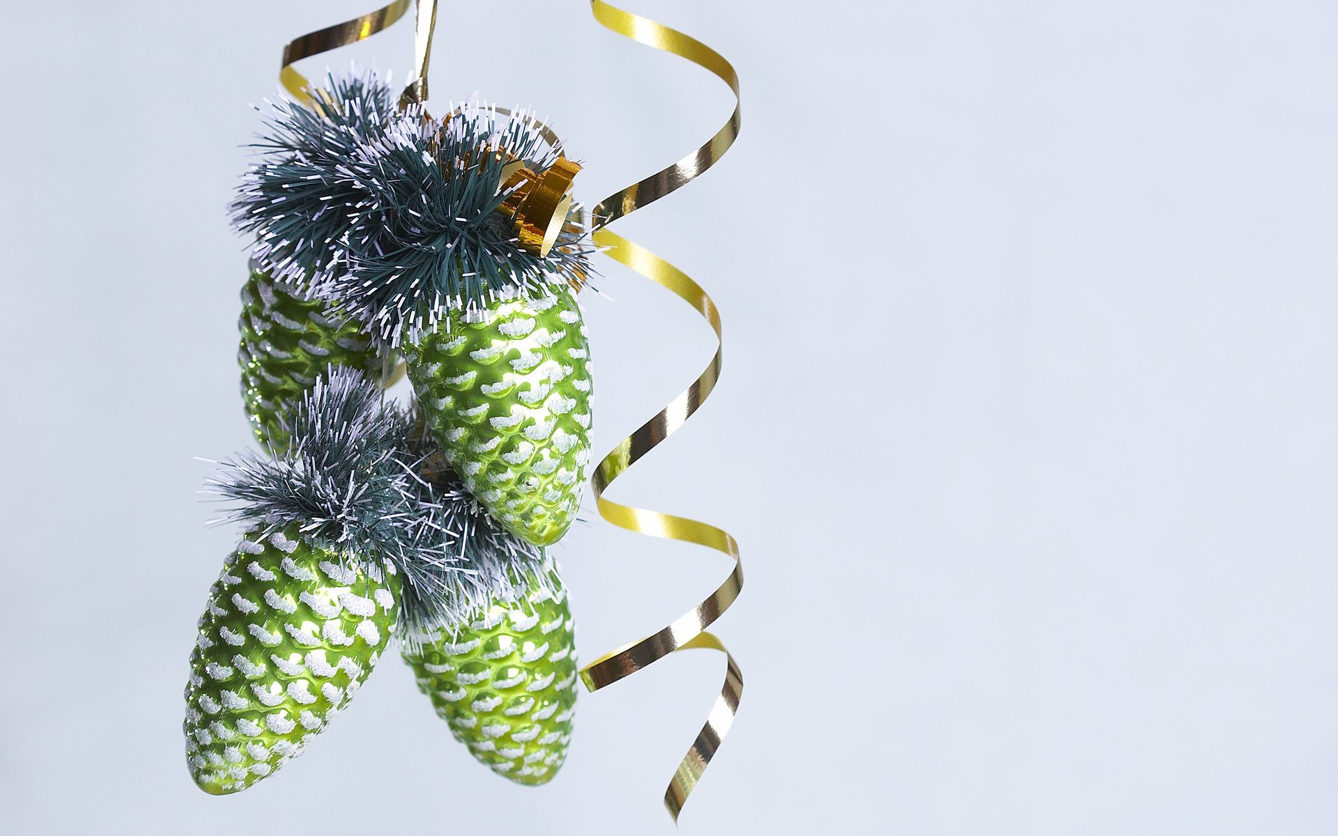 Rami di abete di Capodanno decorati con coni e giocattoli dorati e rossi
