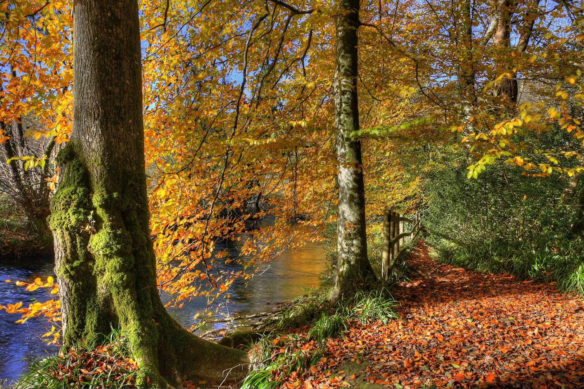 Foresta autunnale - alberi muschiosi e fogliame dorato