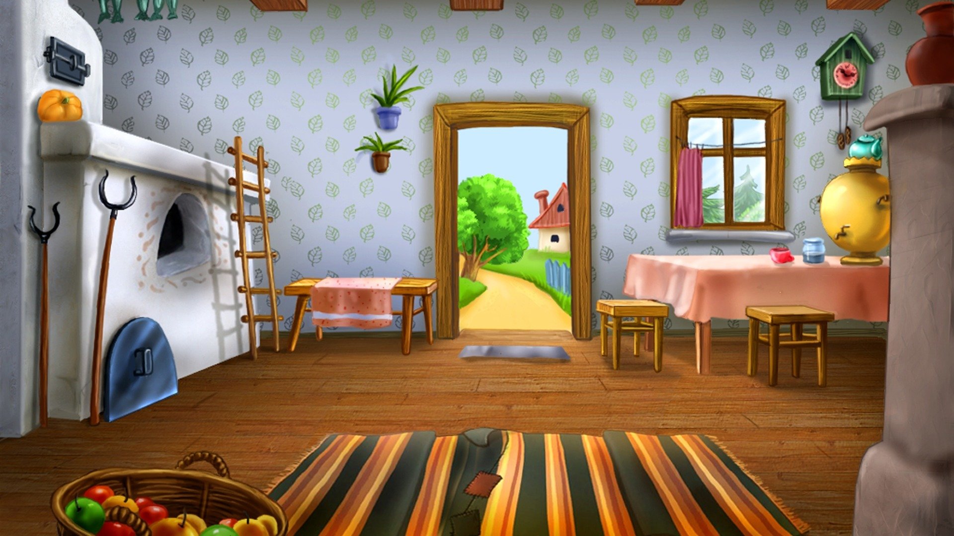Illustrazione di una stanza rustica con una stufa russa