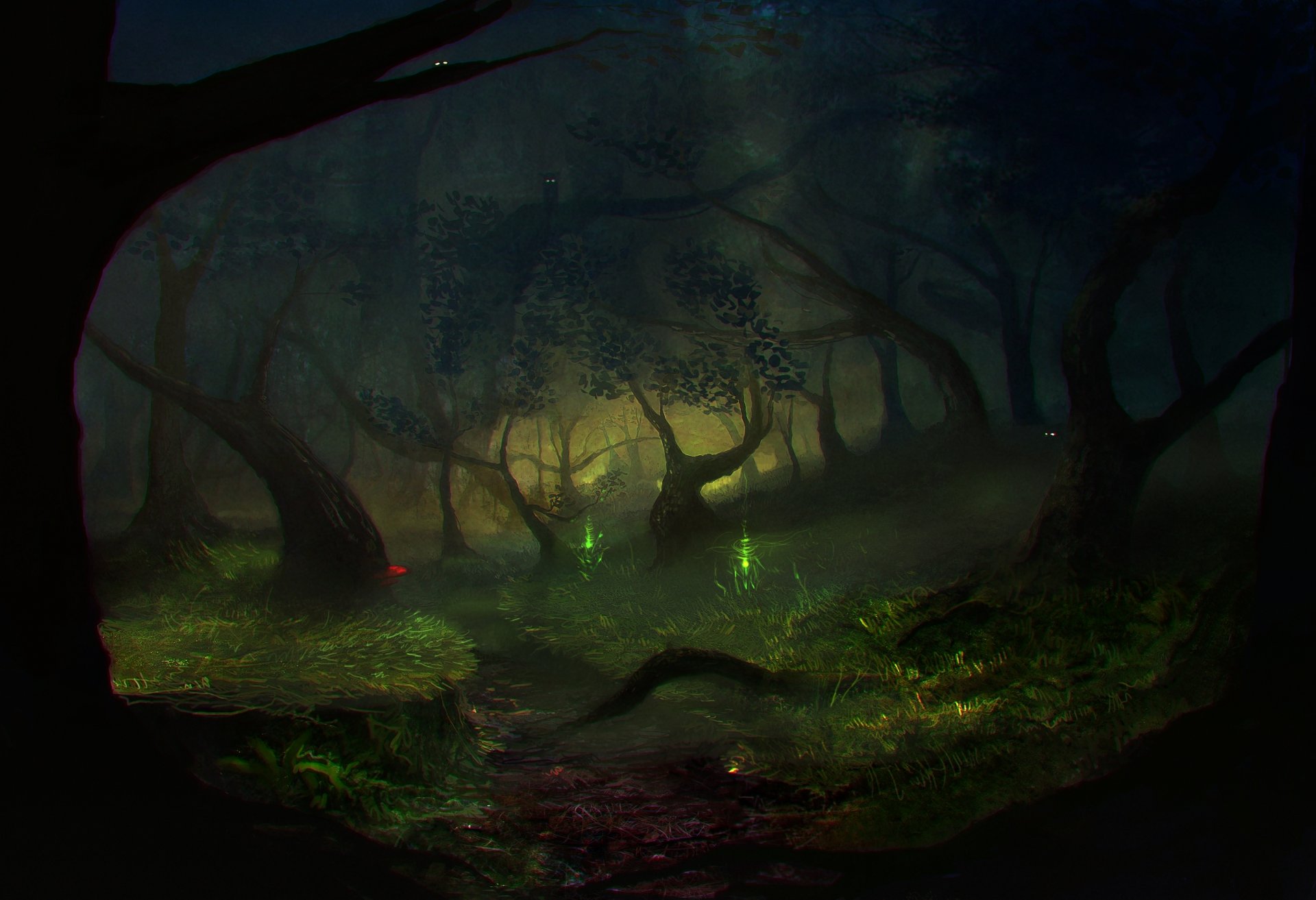 Cupo, paesaggio scuro, alberi storti nella foresta notturna