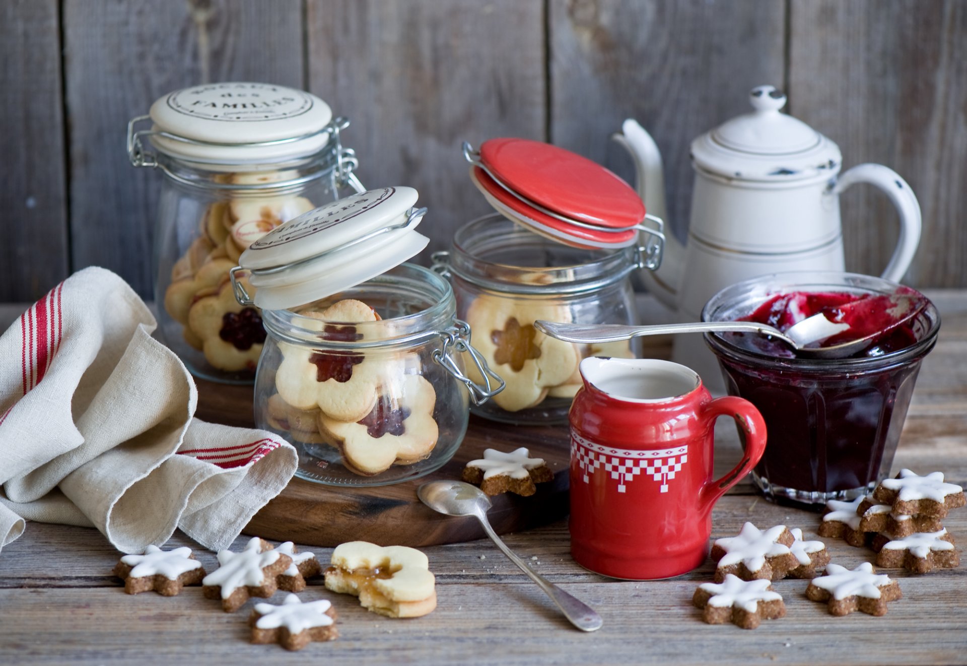 Biscotti asterischi sul tavolo in barattoli colorati