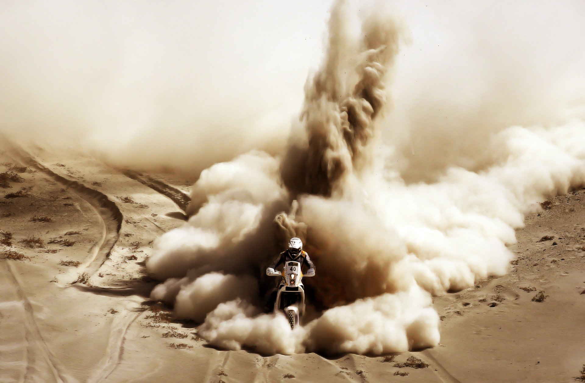 Motociclista cavalca nel deserto accelerando la sabbia in diverse direzioni con un'enorme colonna di fumo