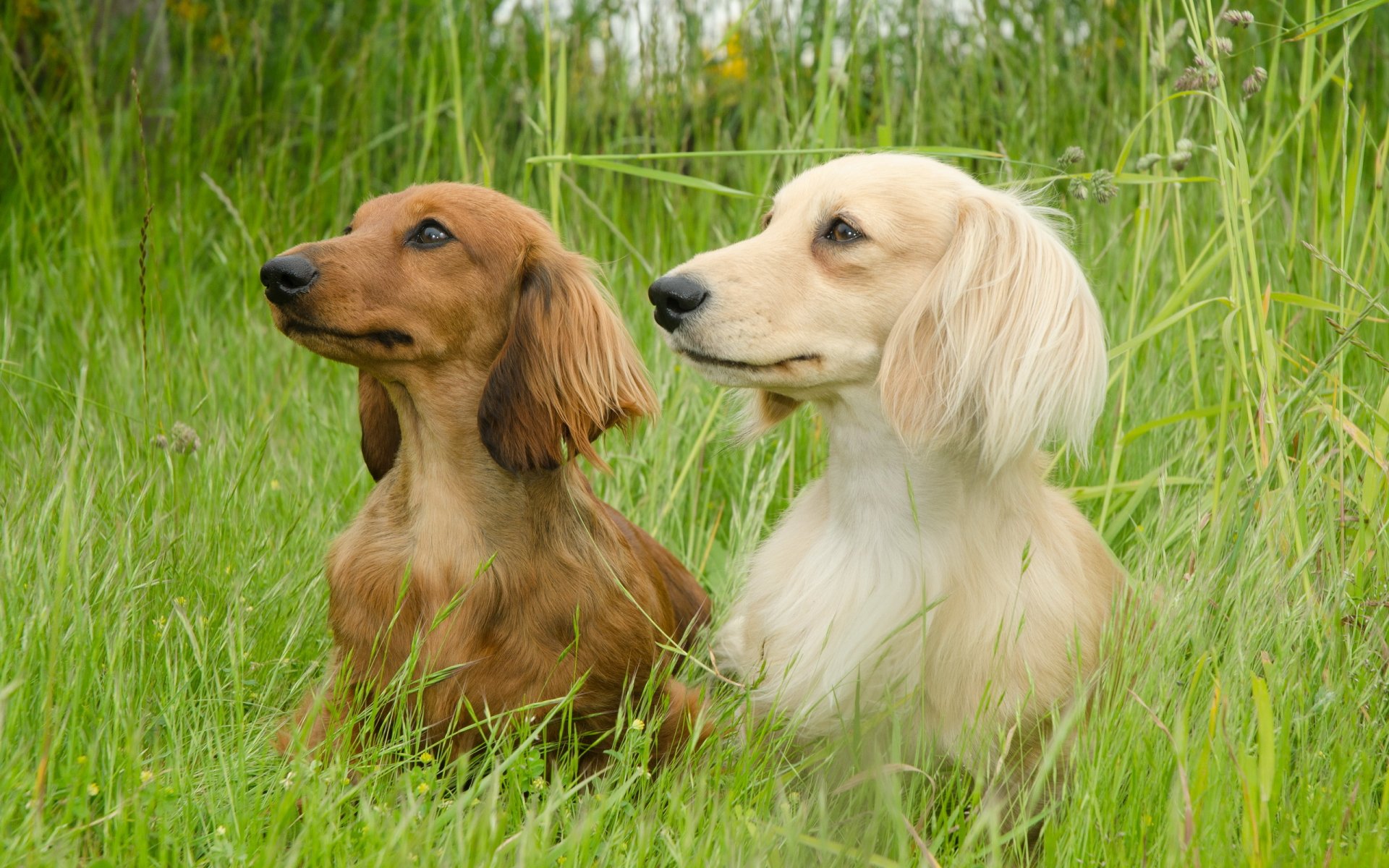 Due bassotti in estate su una passeggiata, seduti nell'erba verde