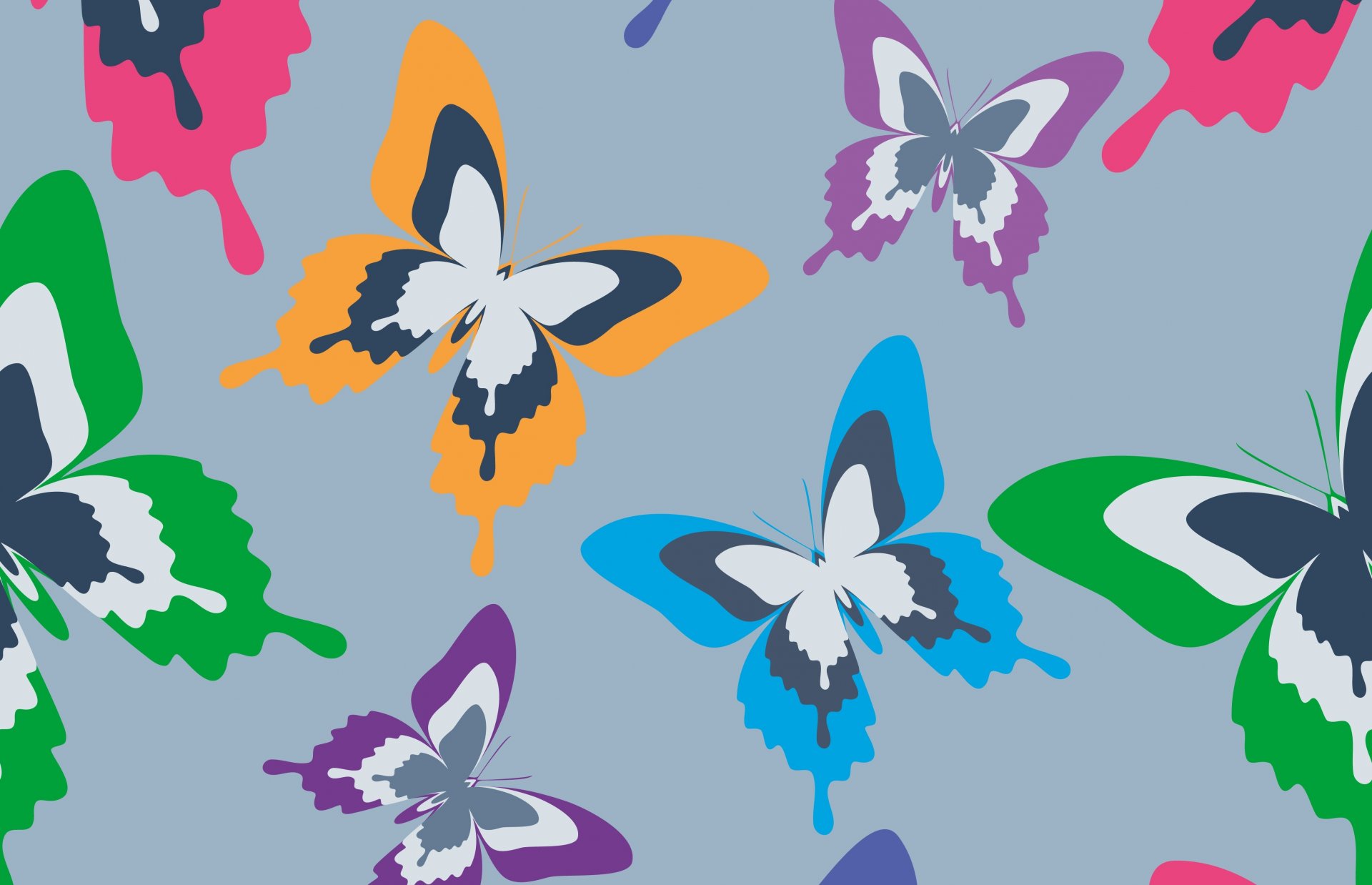 Cornice con farfalle sul tavolo tra libri, aghi e bolle