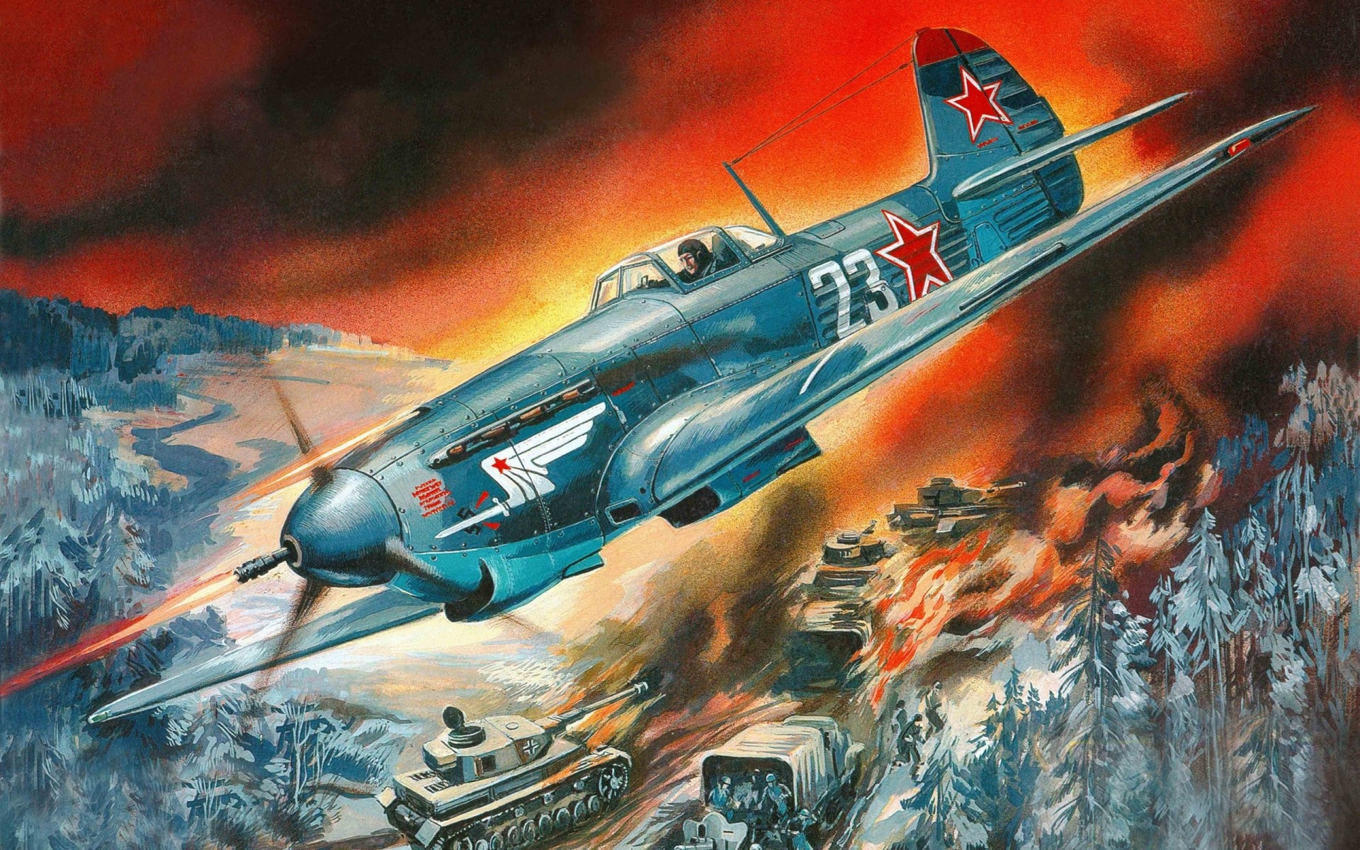 Un caccia monomotore nel cielo attacca i carri armati tedeschi