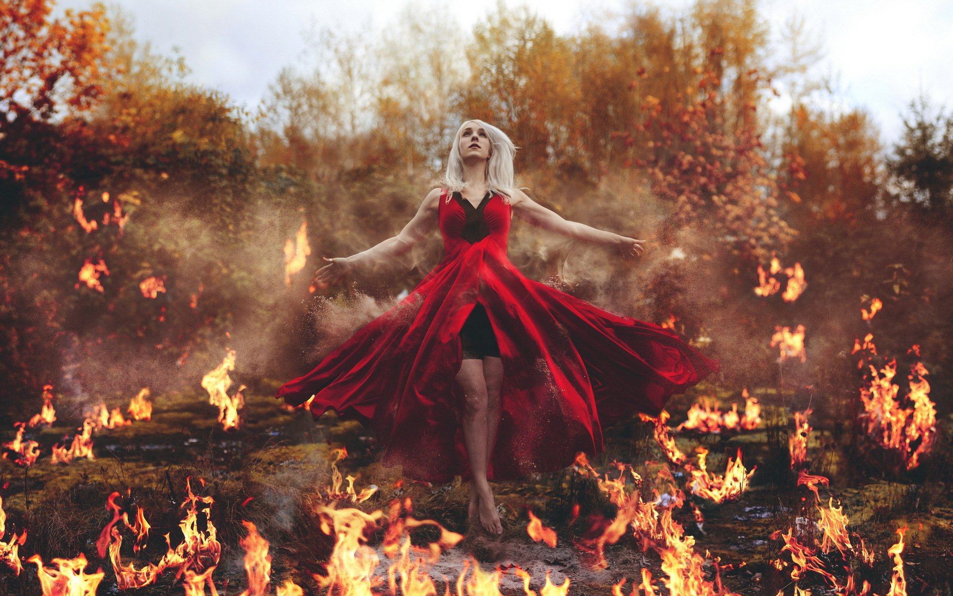 Ragazza in lingerie con armi sullo sfondo di fiamme