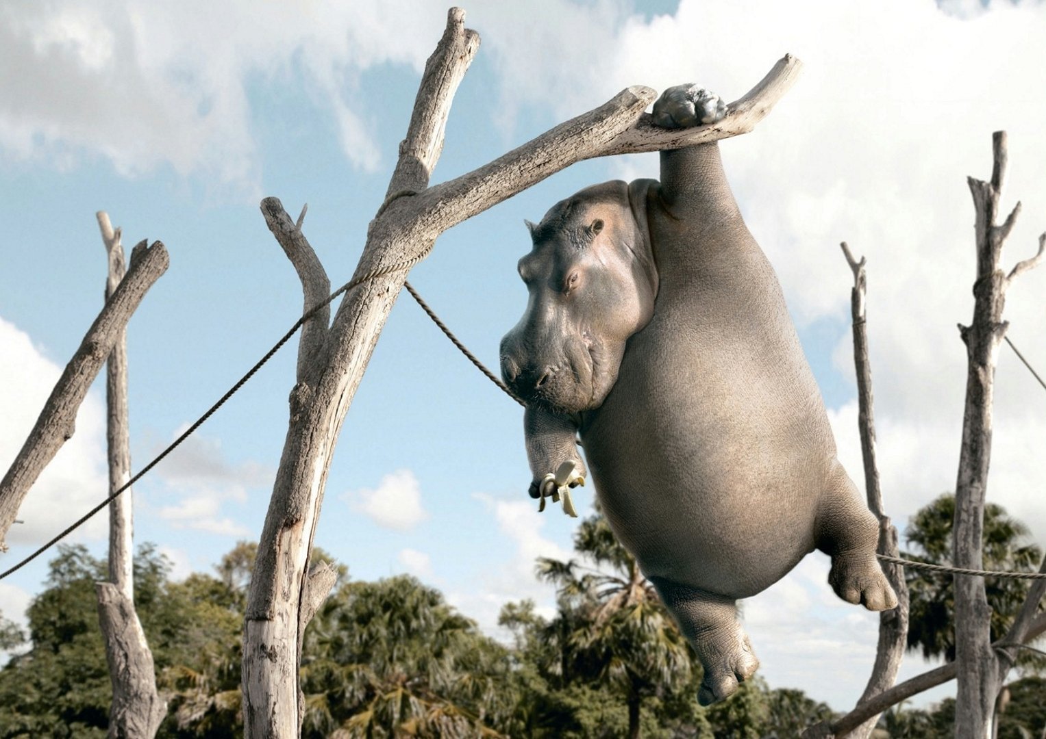 L'ippopotamo salta ordinatamente dall'albero aggrappandosi ai rami