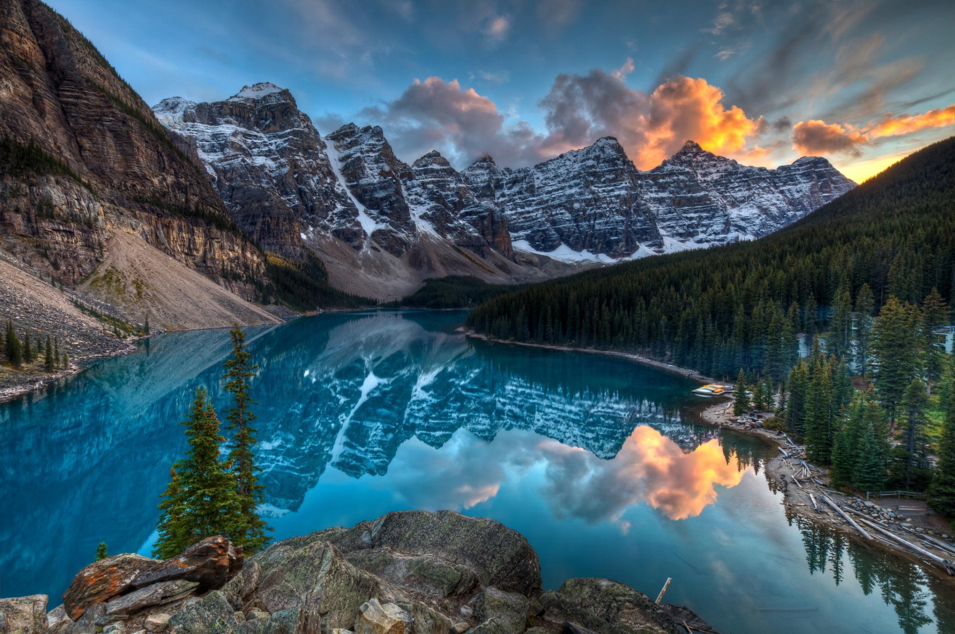 Le nuvole si riflettono nel lago ai piedi delle montagne
