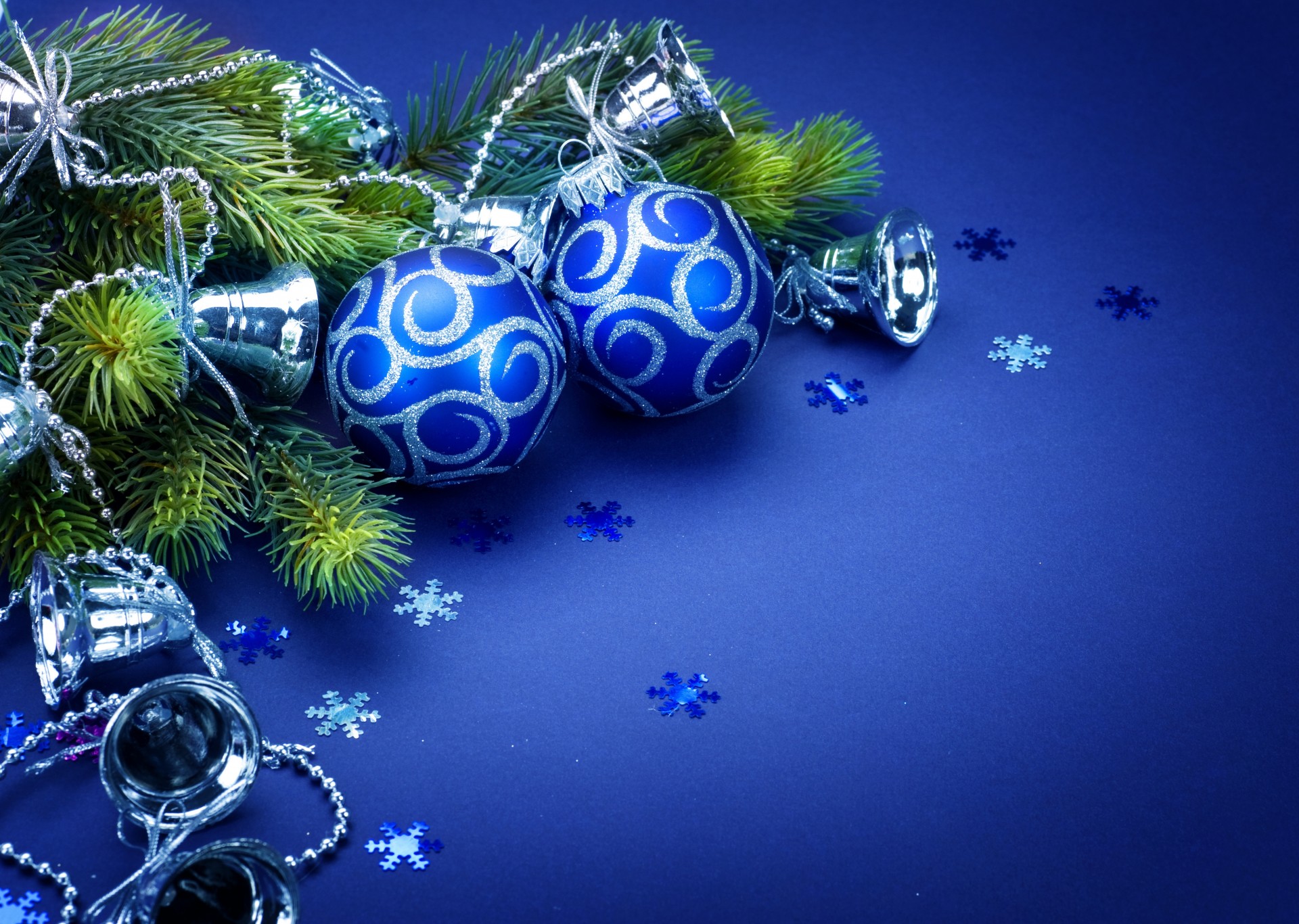 Palline blu su un ramo di abete rosso