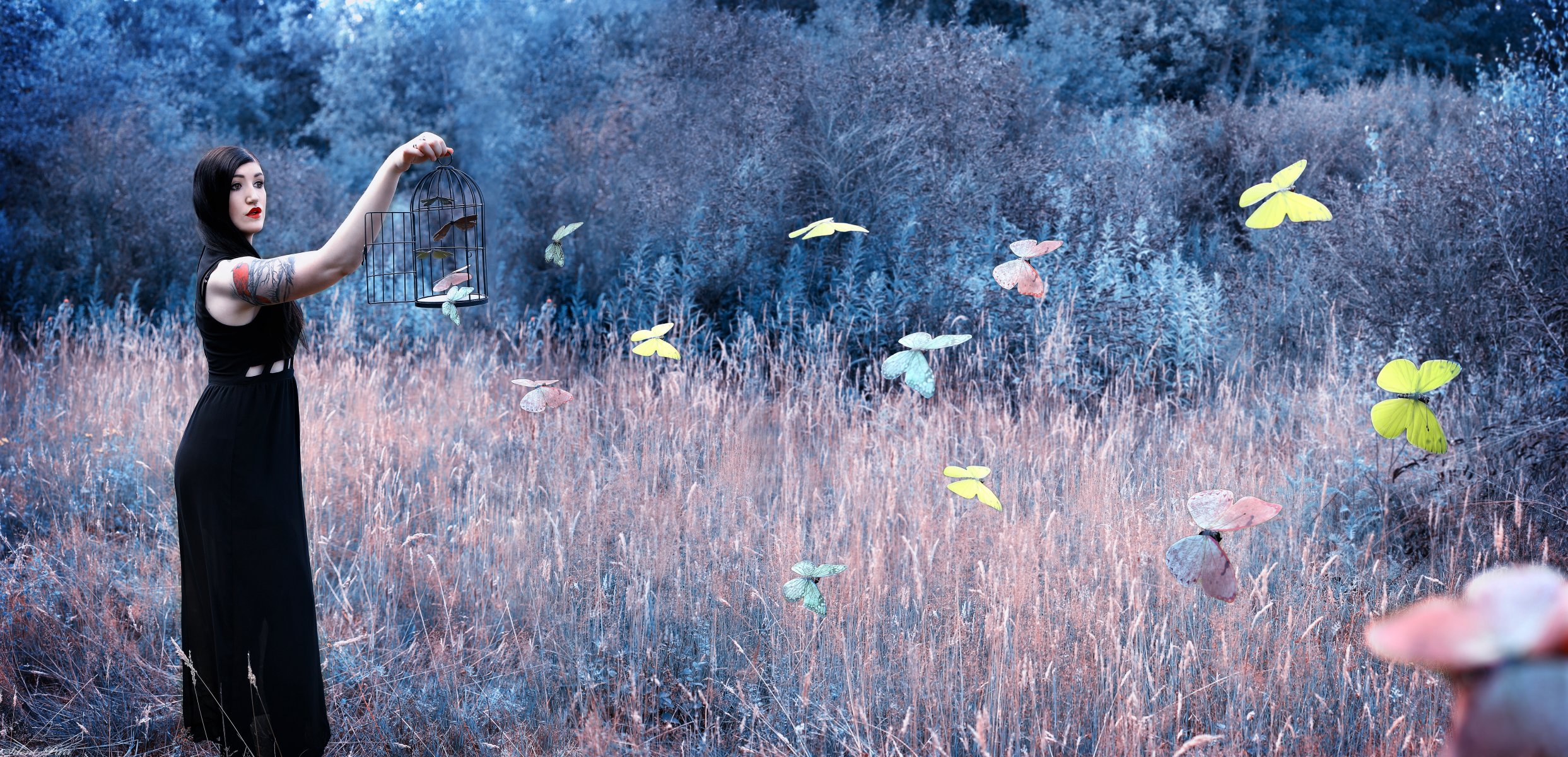 La ragazza rilascia farfalle luminose dalla gabbia