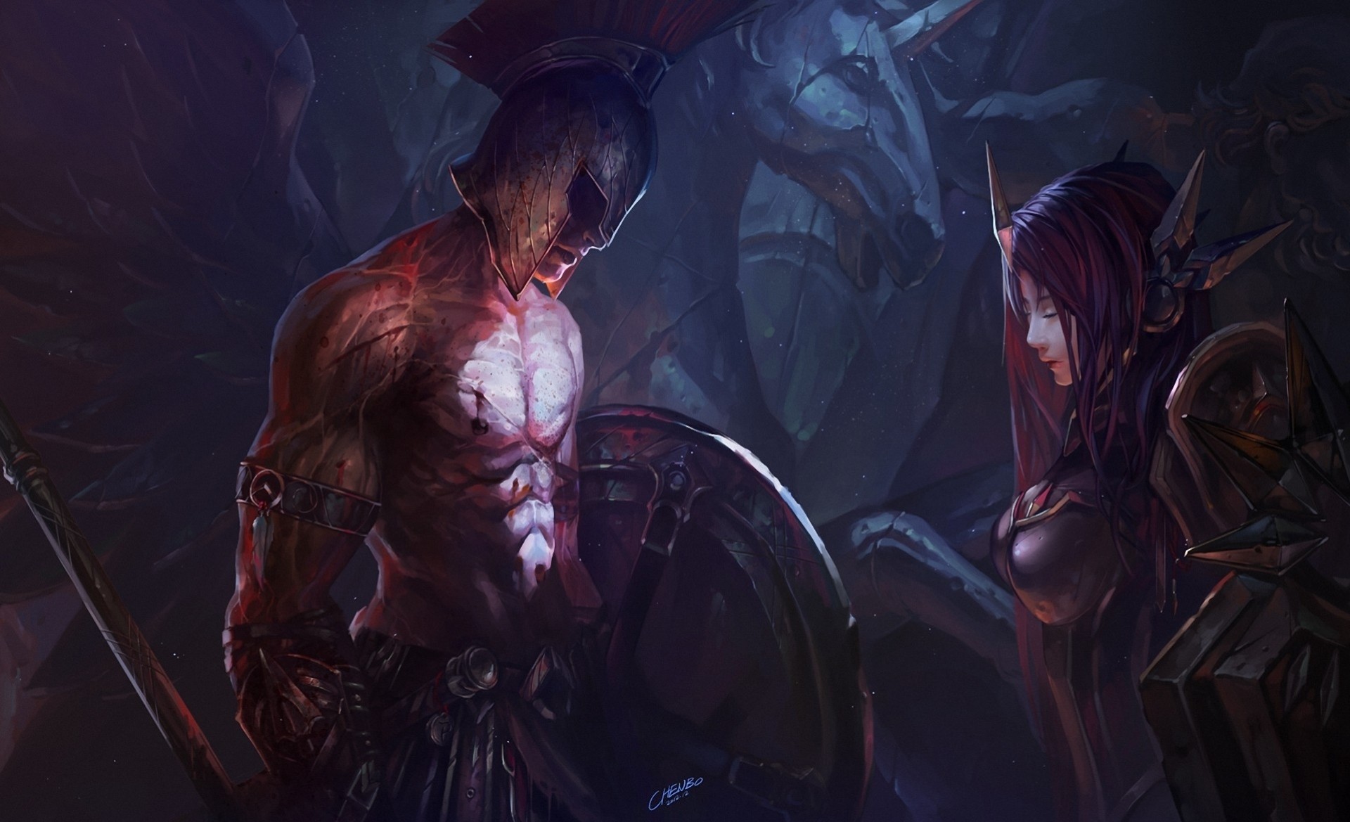 Ragazza in armatura e guerriero con un elmo con uno scudo